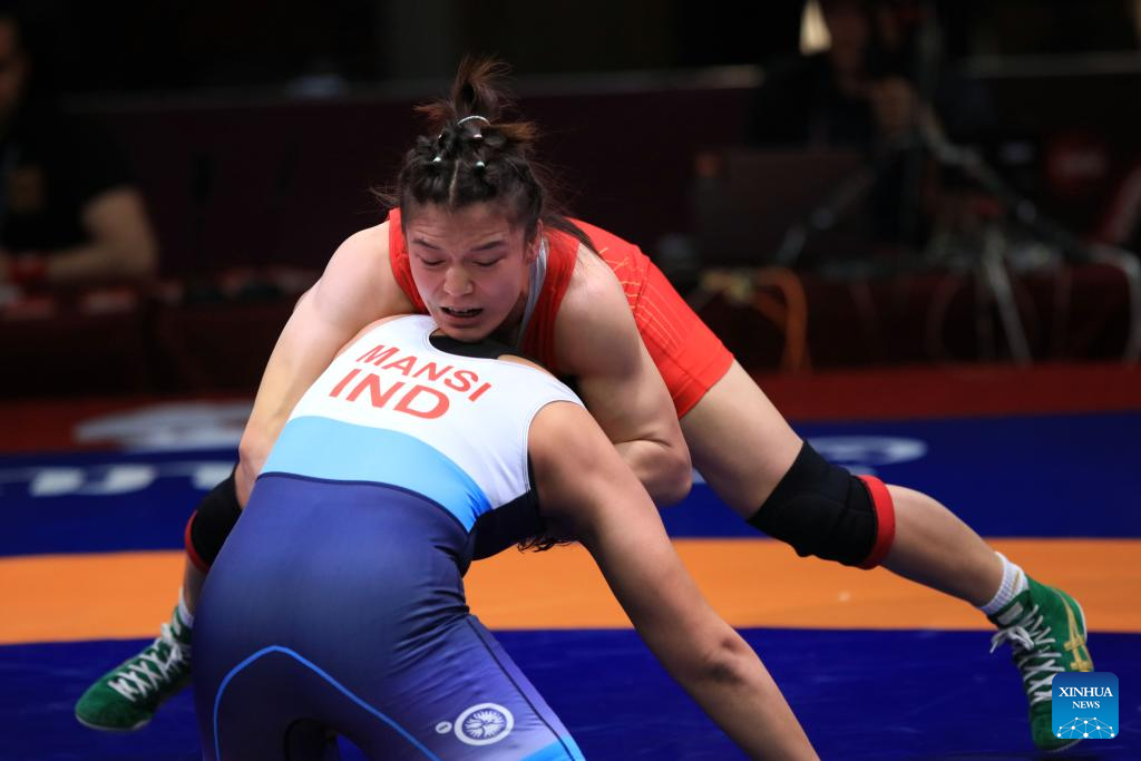 China's Li Zelu (R) competes against India's Mansi Lather during the women's 68kg semifinal match at the Senior Asian Wrestling Championships in Amman, Jordan, March 27, 2025. (Photo by Mohammad Abu Ghosh/Xinhua)