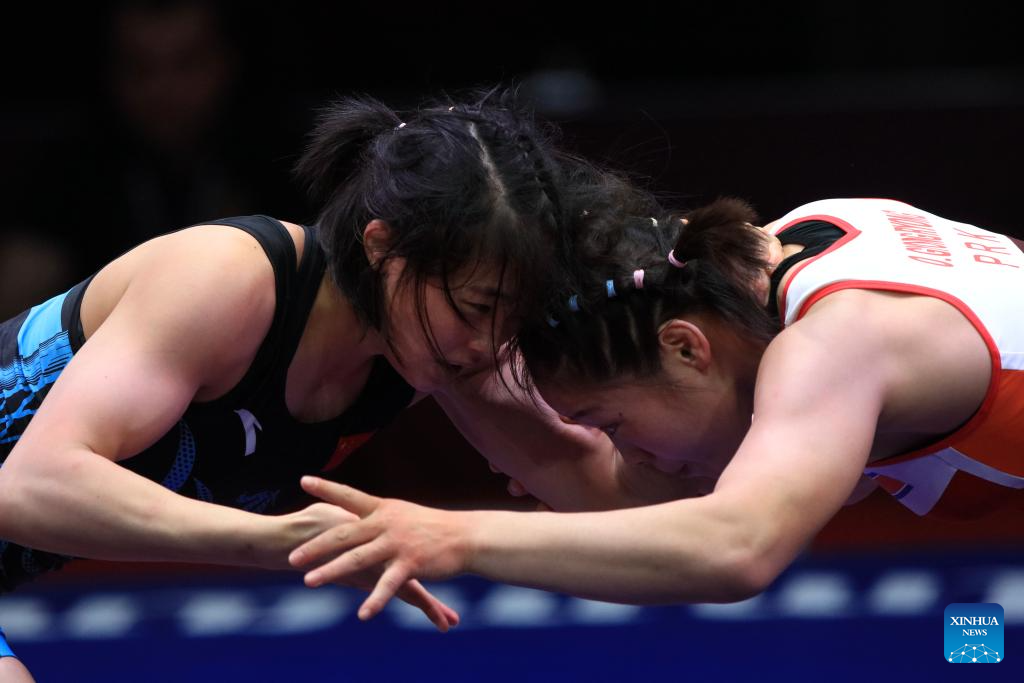 China's Li Yuxuan (L) competes against Oh Kyong Ryong of the Democratic People's Republic of Korea (DPRK) during the women's 55kg final match at the Senior Asian Wrestling Championships in Amman, Jordan, March 27, 2025. (Photo by Mohammad Abu Ghosh/Xinhua)