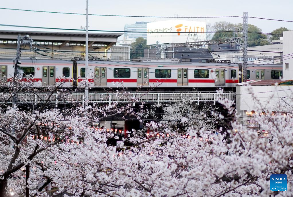 A tram runs past cherry blossoms along the Meguro River in Tokyo, Japan, March 30, 2025. (Xinhua/Jia Haocheng)
