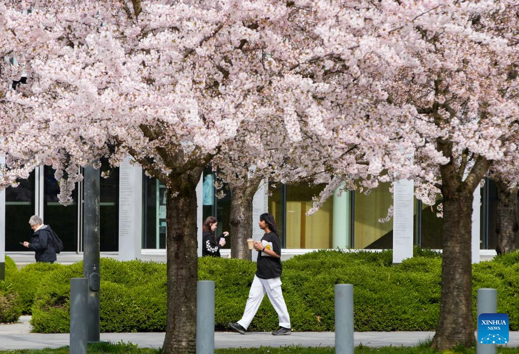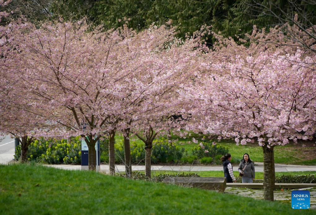 People walk under blooming cherry trees in Vancouver, British Columbia, Canada, March 30, 2025. (Photo by Liang Sen/ Xinhua)