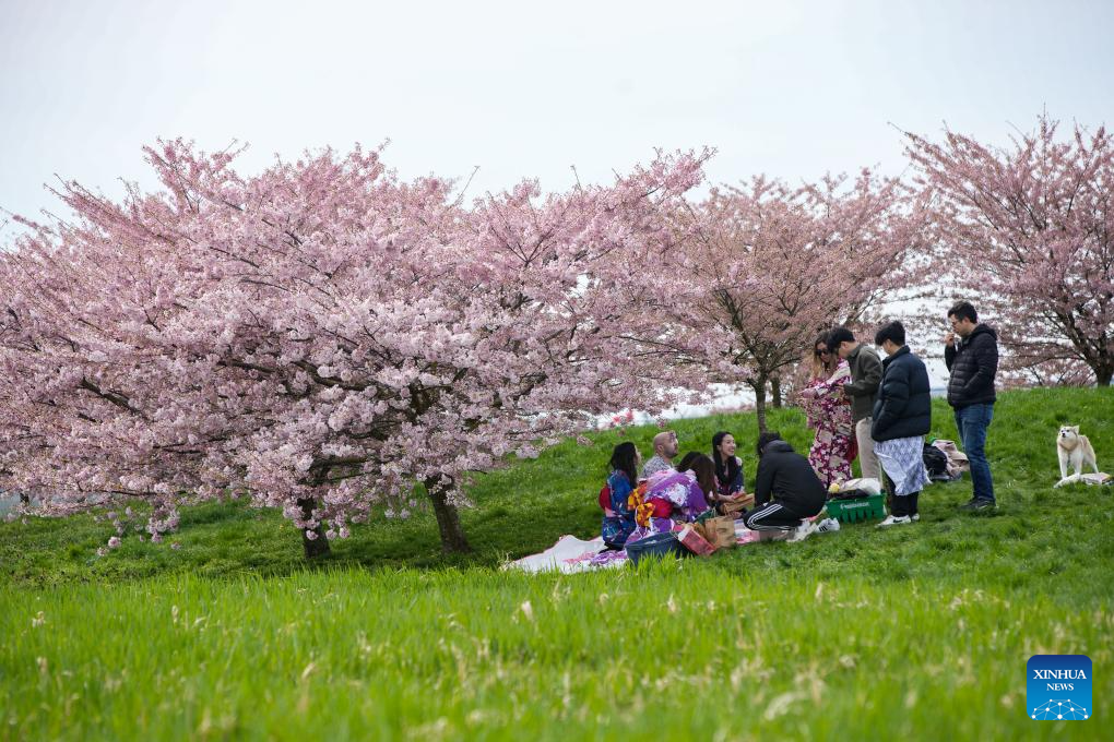 People enjoy leisure time under blooming cherry trees in Vancouver, British Columbia, Canada, March 30, 2025. (Photo by Liang Sen/ Xinhua)