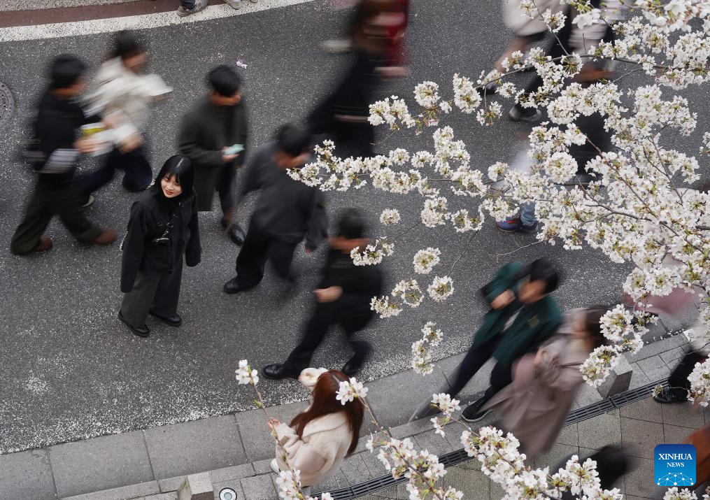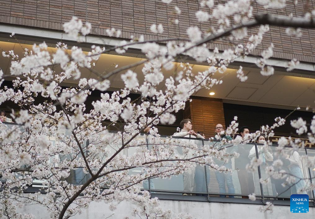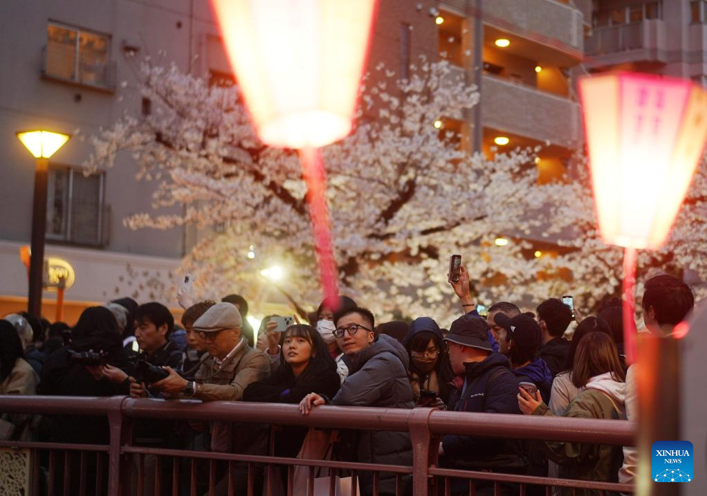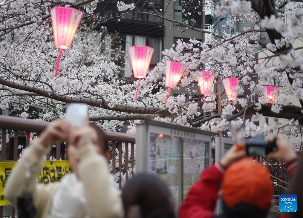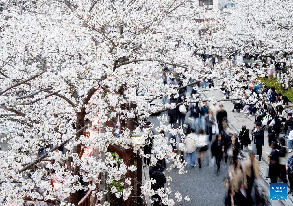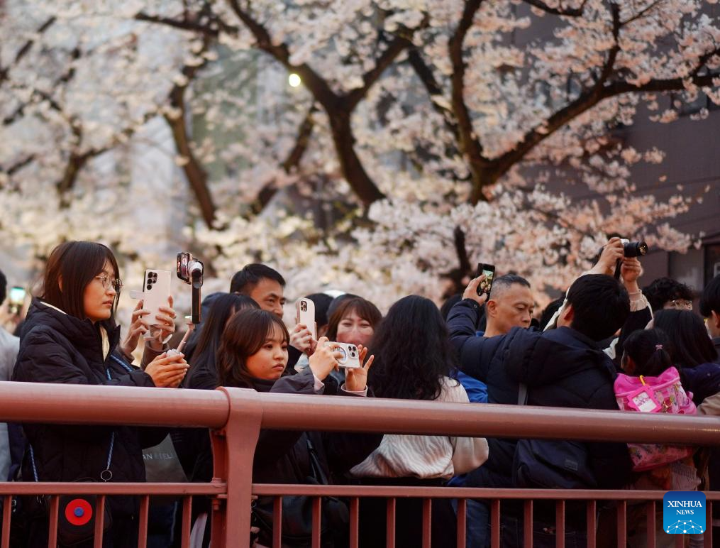 People view cherry blossoms along the Meguro River in Tokyo, Japan, March 30, 2025. (Xinhua/Jia Haocheng)