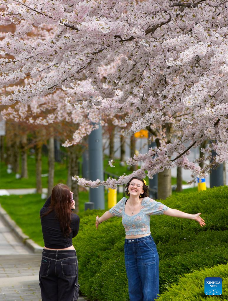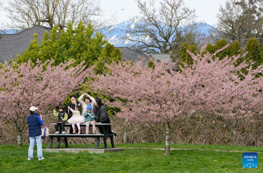 People pose for photos with cherry blossoms in Vancouver, British Columbia, Canada, March 30, 2025. (Photo by Liang Sen/ Xinhua)