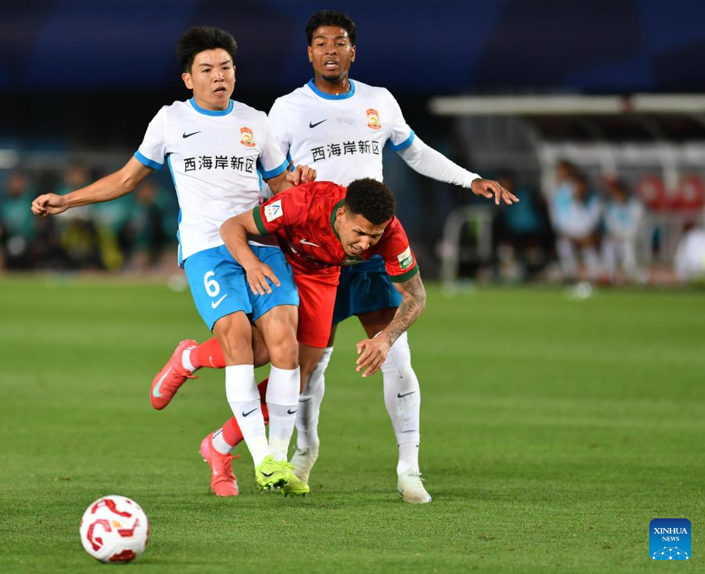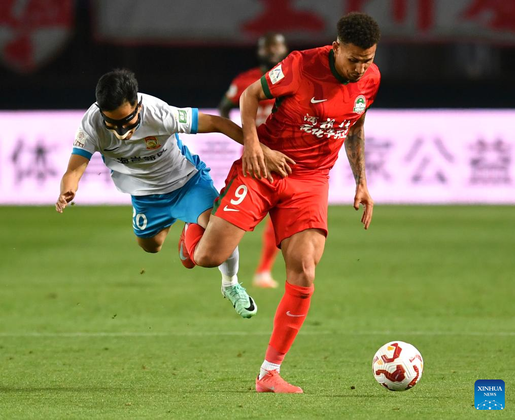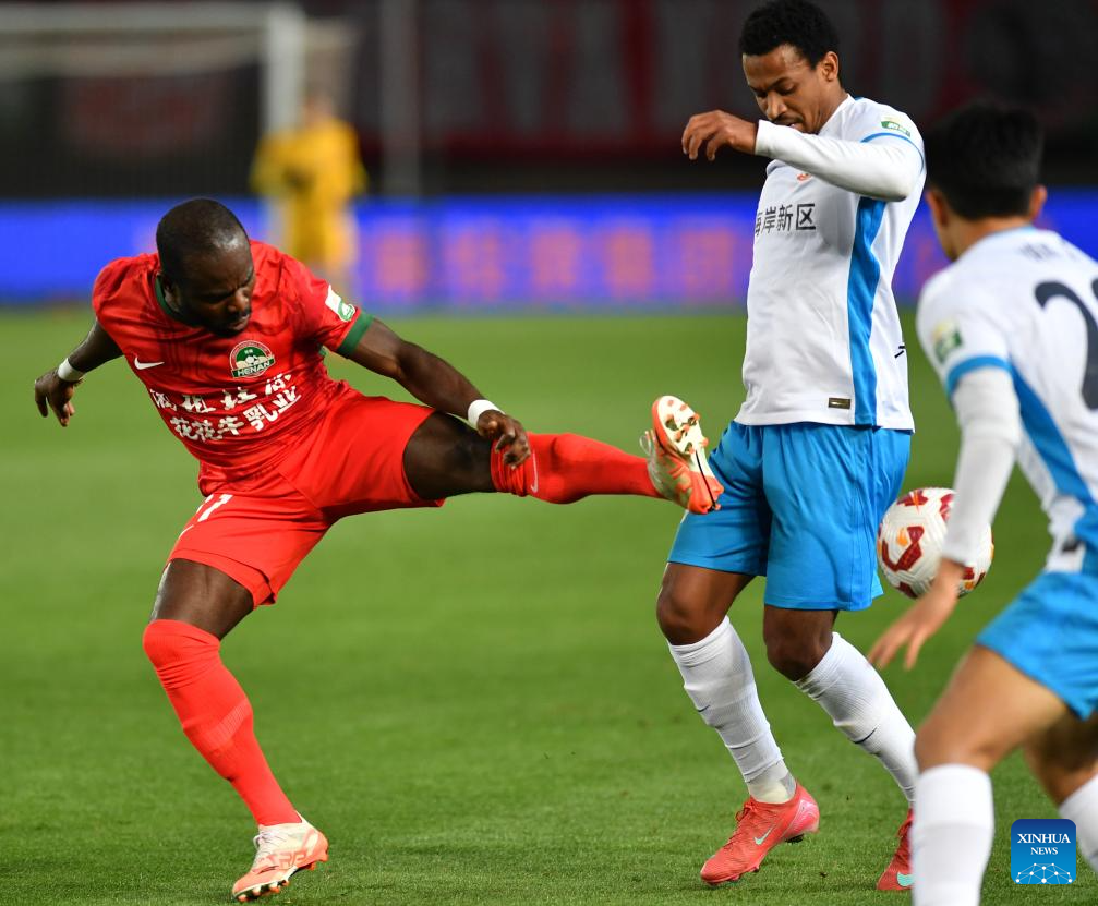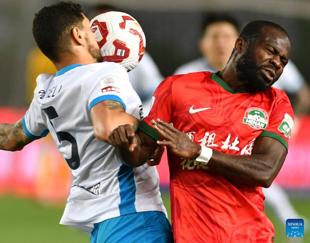 Felippe Cardoso (R) of Henan FC competes during the 4th round match between Qingdao West Coast and Henan FC at the 2025 season Chinese Football Association Super League (CSL) in Zhengzhou, central China's Henan Province, April 1, 2025. (Xinhua/Li Jianan)