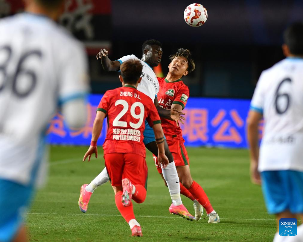 Felippe Cardoso (C) of Henan FC competes during the 4th round match between Qingdao West Coast and Henan FC at the 2025 season Chinese Football Association Super League (CSL) in Zhengzhou, central China's Henan Province, April 1, 2025. (Xinhua/Li Jianan)