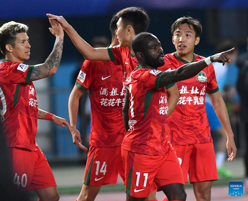 Frank Acheampong (2nd R) of Henan FC celebrates during the 4th round match between Qingdao West Coast and Henan FC at the 2025 season Chinese Football Association Super League (CSL) in Zhengzhou, central China's Henan Province, April 1, 2025. (Xinhua/Li Jianan)