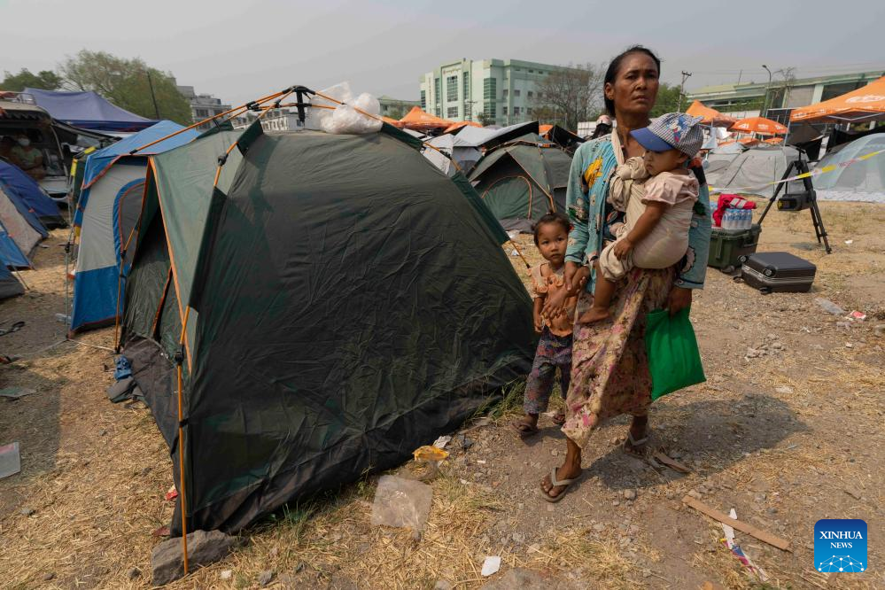 A woman and children are seen at a temporary shelter in Mandalay, Myanmar, April 3, 2025. The death toll from a 7.9-magnitude earthquake in Myanmar has risen to 3,085, with 4,715 people injured and 341 reported missing, according to the Information Team of the State Administration Council on Thursday. (Xinhua/Cai Yang)