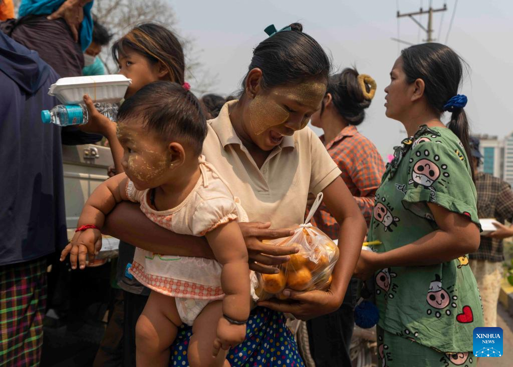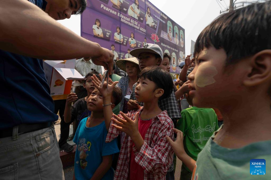 Children receive electrolyte that prevent and treat dehydration at a temporary shelter in Mandalay, Myanmar, April 3, 2025. The death toll from a 7.9-magnitude earthquake in Myanmar has risen to 3,085, with 4,715 people injured and 341 reported missing, according to the Information Team of the State Administration Council on Thursday. (Xinhua/Cai Yang)