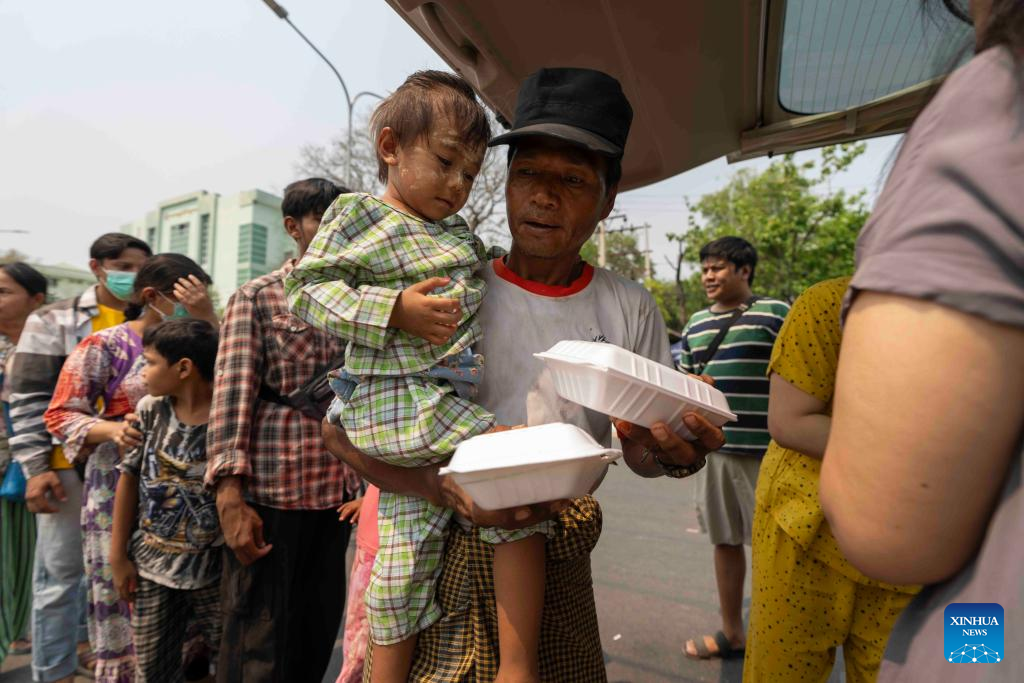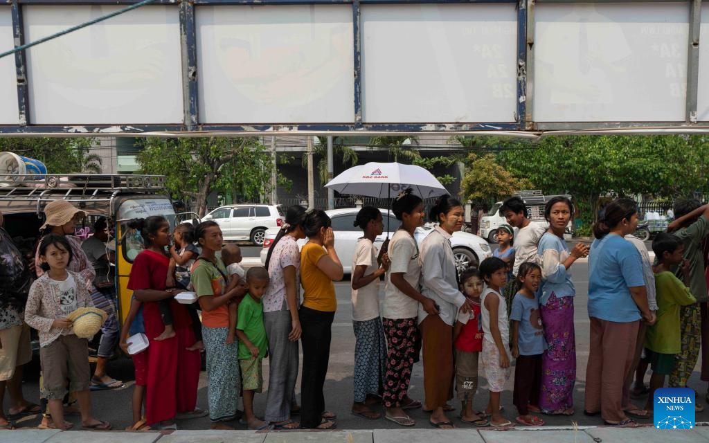 People line up to receive food at a temporary shelter in Mandalay, Myanmar, April 3, 2025. The death toll from a 7.9-magnitude earthquake in Myanmar has risen to 3,085, with 4,715 people injured and 341 reported missing, according to the Information Team of the State Administration Council on Thursday. (Xinhua/Cai Yang)