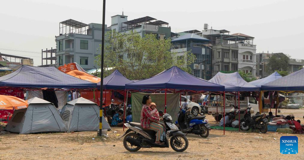 A temporary shelter is seen in Mandalay, Myanmar, April 3, 2025. The death toll from a 7.9-magnitude earthquake in Myanmar has risen to 3,085, with 4,715 people injured and 341 reported missing, according to the Information Team of the State Administration Council on Thursday. (Xinhua/Cai Yang)