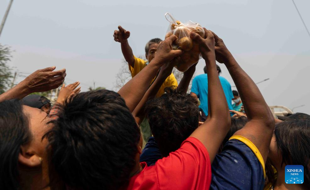 People receive food at a temporary shelter in Mandalay, Myanmar, April 3, 2025. The death toll from a 7.9-magnitude earthquake in Myanmar has risen to 3,085, with 4,715 people injured and 341 reported missing, according to the Information Team of the State Administration Council on Thursday. (Xinhua/Cai Yang)