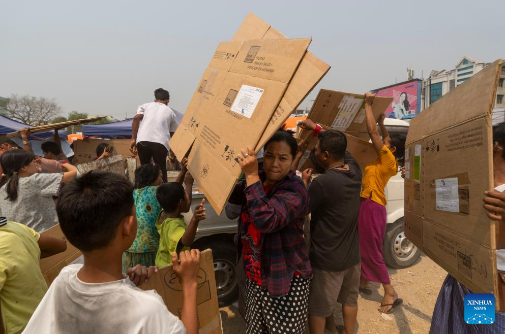 People receive cardboard that can be used as temporary beds at a temporary shelter in Mandalay, Myanmar, April 3, 2025. The death toll from a 7.9-magnitude earthquake in Myanmar has risen to 3,085, with 4,715 people injured and 341 reported missing, according to the Information Team of the State Administration Council on Thursday. (Xinhua/Cai Yang)