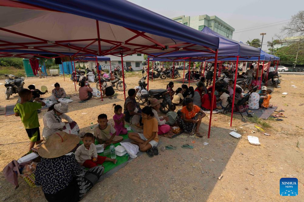 People rest at a temporary shelter in Mandalay, Myanmar, April 3, 2025. The death toll from a 7.9-magnitude earthquake in Myanmar has risen to 3,085, with 4,715 people injured and 341 reported missing, according to the Information Team of the State Administration Council on Thursday. (Xinhua/Cai Yang)
