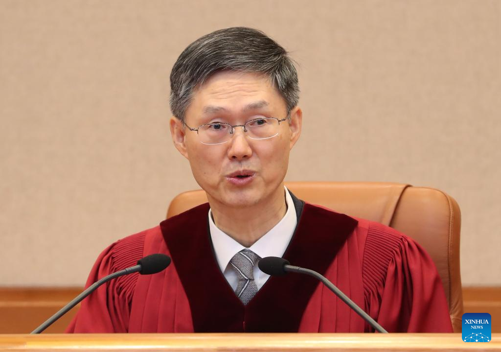 Moon Hyung-bae, acting chief of the court, read out a ruling on Yoon's impeachment, which was broadcast live nationwide, saying it was a unanimous decision of eight justices. (Photo by Jun Hyosang/Xinhua)