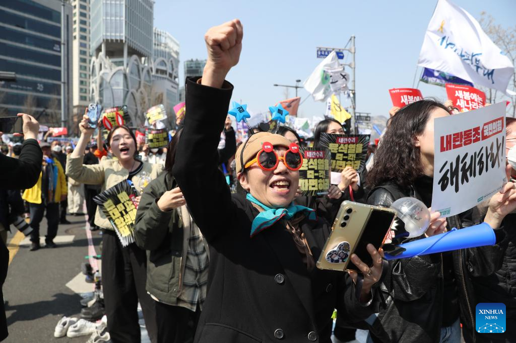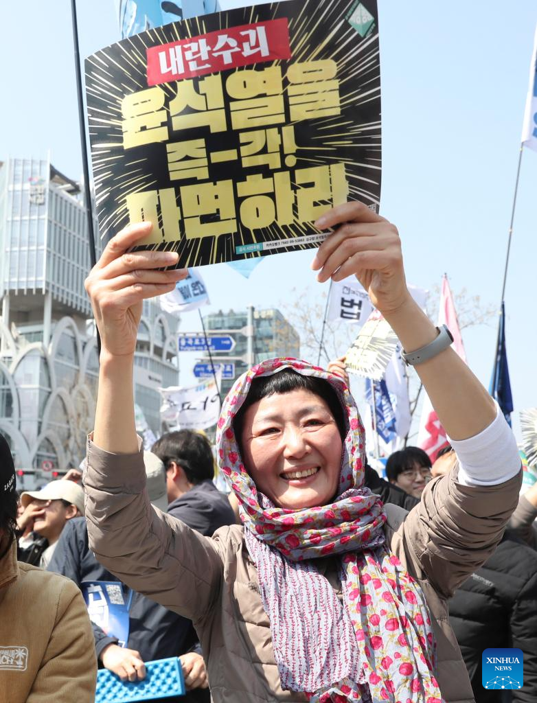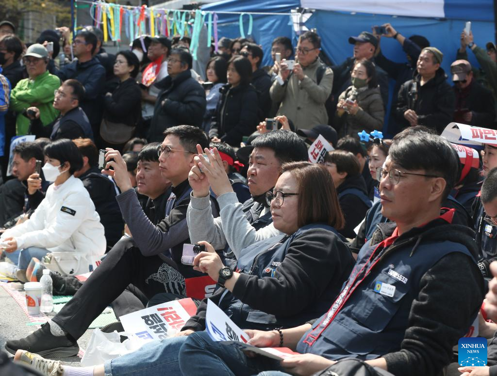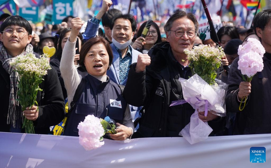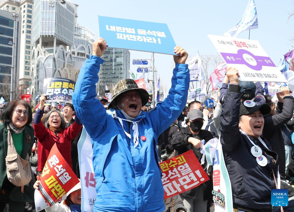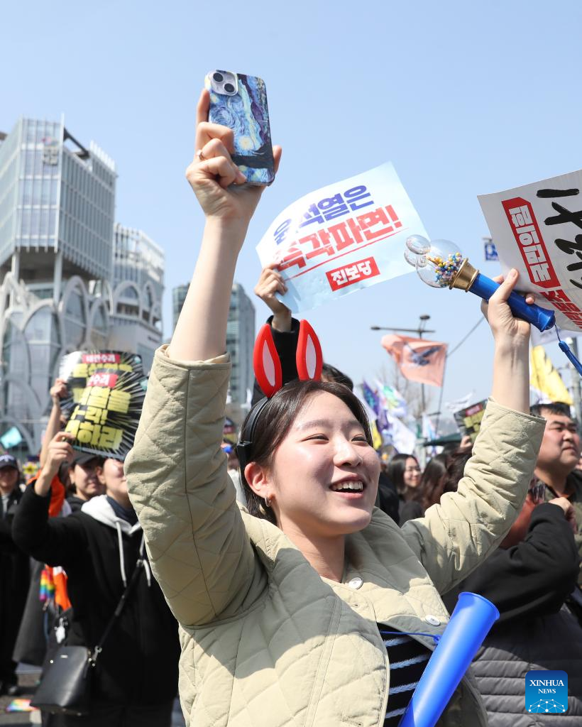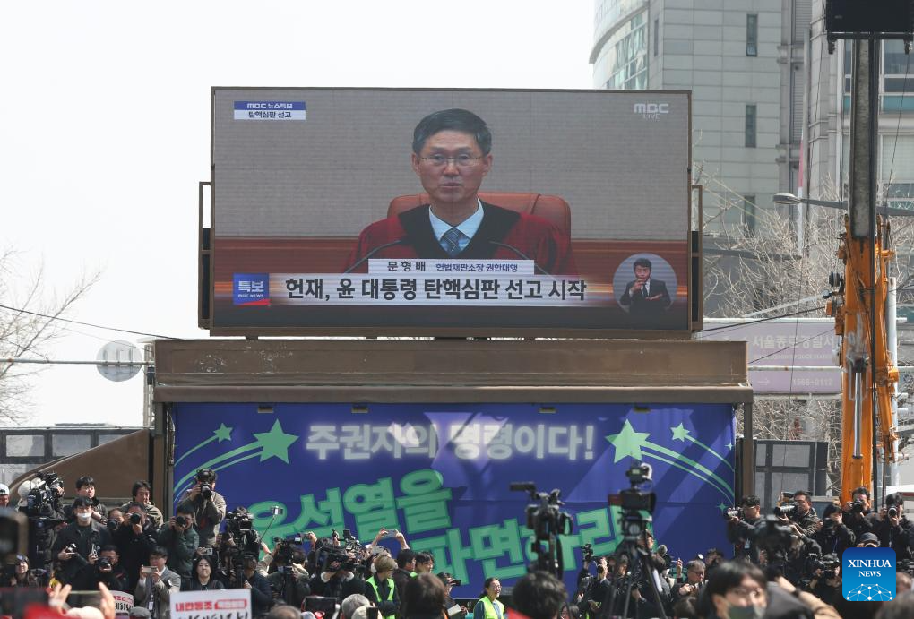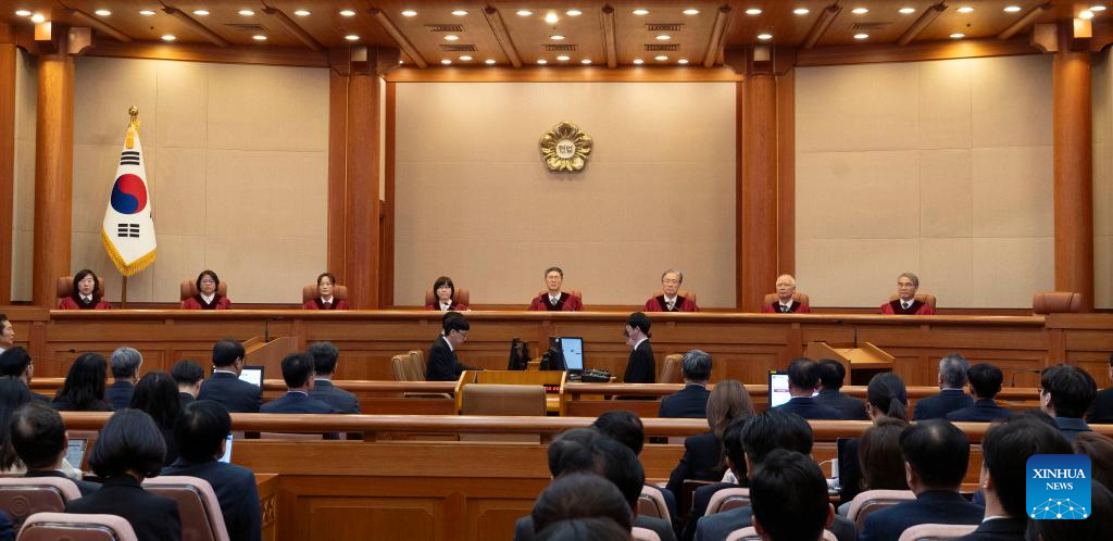 SEOUL, April 4 (Xinhua) -- South Korean President Yoon Suk-yeol was ousted from office Friday as the constitutional court upheld a motion by the parliament to impeach Yoon over his short-lived martial law imposition last December.