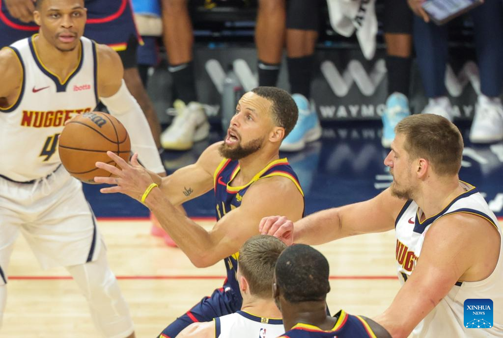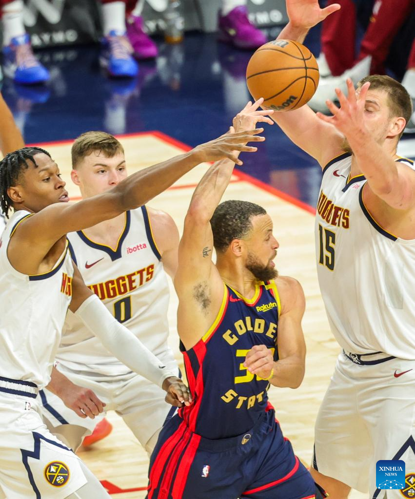 Stephen Curry (2nd R) of Golden State Warriors competes during the 2024-2025 NBA regular season game between Golden State Warriors and Denver Nuggets in San Francisco, the United States, April 4, 2025. (Photo by Arthur Dong/Xinhua)
