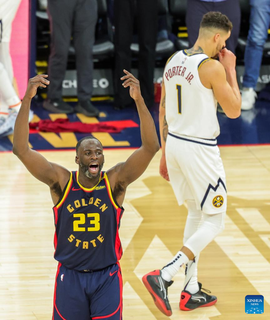 Draymond Green (L) of Golden State Warriors reacts during the 2024-2025 NBA regular season game between Golden State Warriors and Denver Nuggets in San Francisco, the United States, April 4, 2025. (Photo by Arthur Dong/Xinhua)