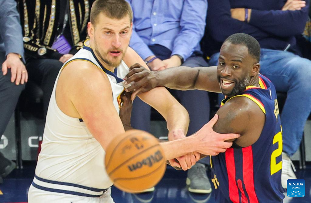 Draymond Green (R) of Golden State Warriors vies with Nikola Jokic of Denver Nuggets during the 2024-2025 NBA regular season game between Golden State Warriors and Denver Nuggets in San Francisco, the United States, April 4, 2025. (Photo by Arthur Dong/Xinhua)