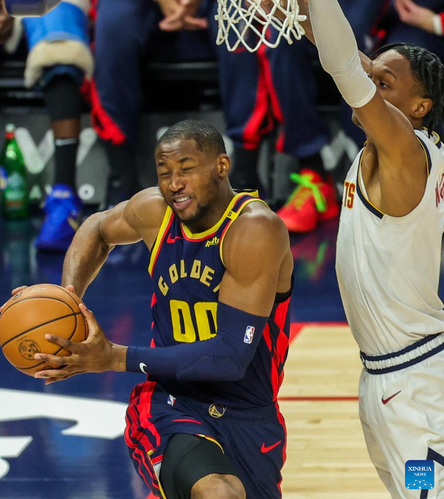 Jonathan Kuminga (L) of Golden State Warriors competes during the 2024-2025 NBA regular season game between Golden State Warriors and Denver Nuggets in San Francisco, the United States, April 4, 2025. (Photo by Arthur Dong/Xinhua)
