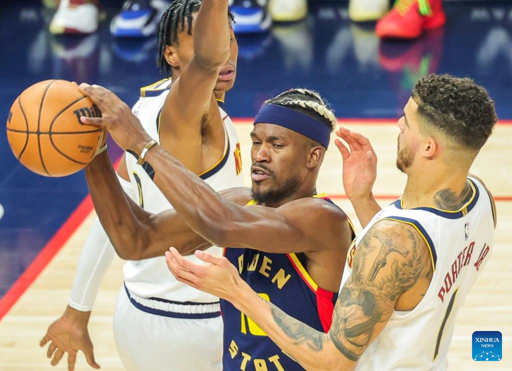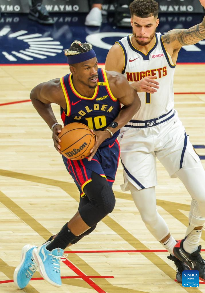 Jimmy Butler (C) of Golden State Warriors competes during the 2024-2025 NBA regular season game between Golden State Warriors and Denver Nuggets in San Francisco, the United States, April 4, 2025. (Photo by Arthur Dong/Xinhua)
