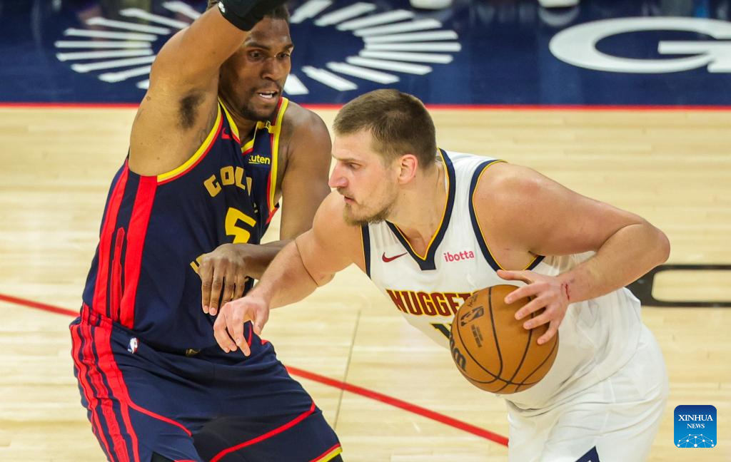 Nikola Jokic (R) of Denver Nuggets competes during the 2024-2025 NBA regular season game between Golden State Warriors and Denver Nuggets in San Francisco, the United States, April 4, 2025. (Photo by Arthur Dong/Xinhua)