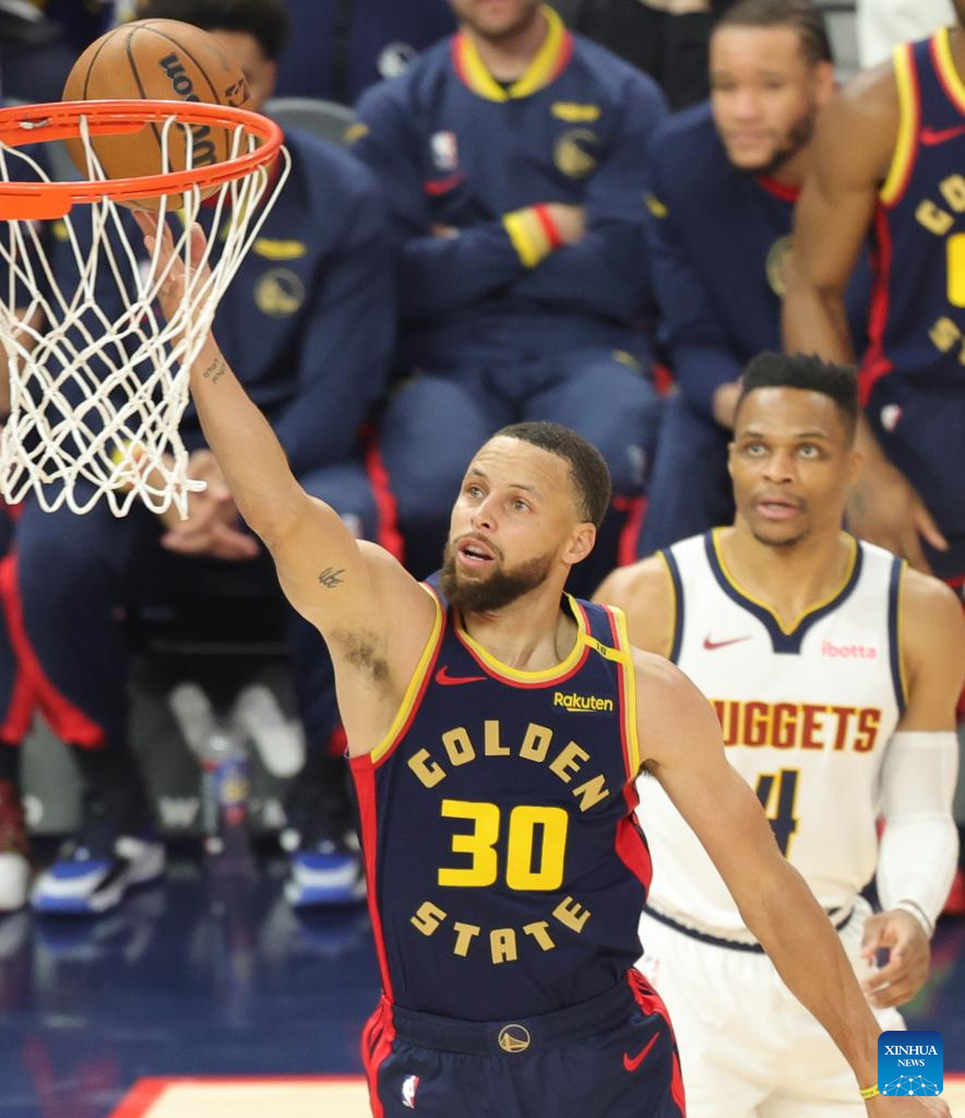 Stephen Curry (2nd L) of Golden State Warriors goes for a lay-up during the 2024-2025 NBA regular season game between Golden State Warriors and Denver Nuggets in San Francisco, the United States, April 4, 2025. (Photo by Arthur Dong/Xinhua)