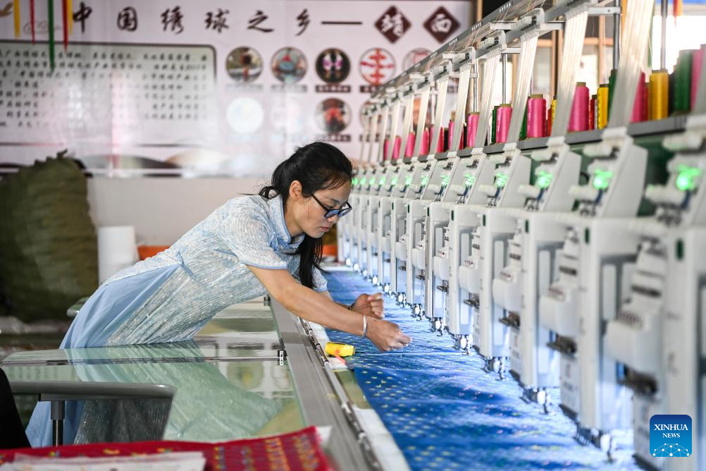 Wang Xiufen, the chief craftsperson of an embroidered ball production company, adjusts the divice at the company in Jingxi, south China's Guangxi Zhuang Autonomous Region, April 3, 2024. Guangxi Zhuang Autonomous Region is the autonomous region with the largest population of ethnic minorities in China, with multiple ethnic groups such as Zhuang, Yao, Miao, and Dong who have lived there for generations. Throwing embroidered balls is a traditional sport that Guangxi people enjoy, carrying a profound folk heritage. In Zhuang culture, embroidered ball is a symbol of love.
