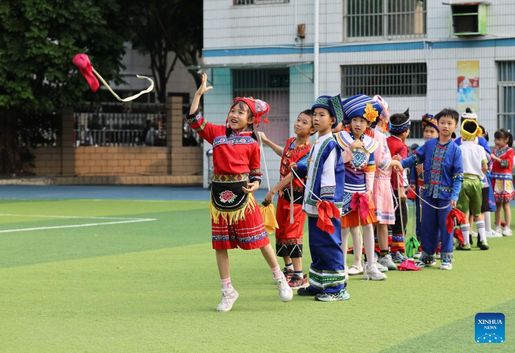 A student throws the embroidered ball at Minzu Road East Primary School in Nanning, south China's Guangxi Zhuang Autonomous Region, Nov 6, 2024. Guangxi Zhuang Autonomous Region is the autonomous region with the largest population of ethnic minorities in China, with multiple ethnic groups such as Zhuang, Yao, Miao, and Dong who have lived there for generations. Throwing embroidered balls is a traditional sport that Guangxi people enjoy, carrying a profound folk heritage. In Zhuang culture, embroidered ball is a symbol of love.