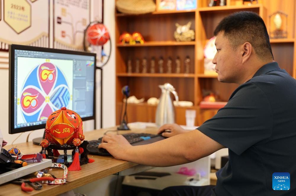 Liu Changlei, the general manager of an embroidered ball production company, designs embroidered balls in his office in Jingxi, south China's Guangxi Zhuang Autonomous Region, Oct. 17, 2024. Guangxi Zhuang Autonomous Region is the autonomous region with the largest population of ethnic minorities in China, with multiple ethnic groups such as Zhuang, Yao, Miao, and Dong who have lived there for generations. Throwing embroidered balls is a traditional sport that Guangxi people enjoy, carrying a profound folk heritage. In Zhuang culture, embroidered ball is a symbol of love.