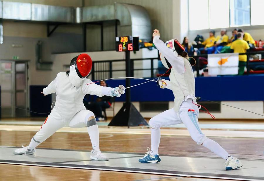 Min, 14, from Beijing No. 35 Middle School, won by a score of 15-4 in the final against Sofia Garanina of Cyprus to collect her first gold medal at the Gymnasiade in her debut appearance.