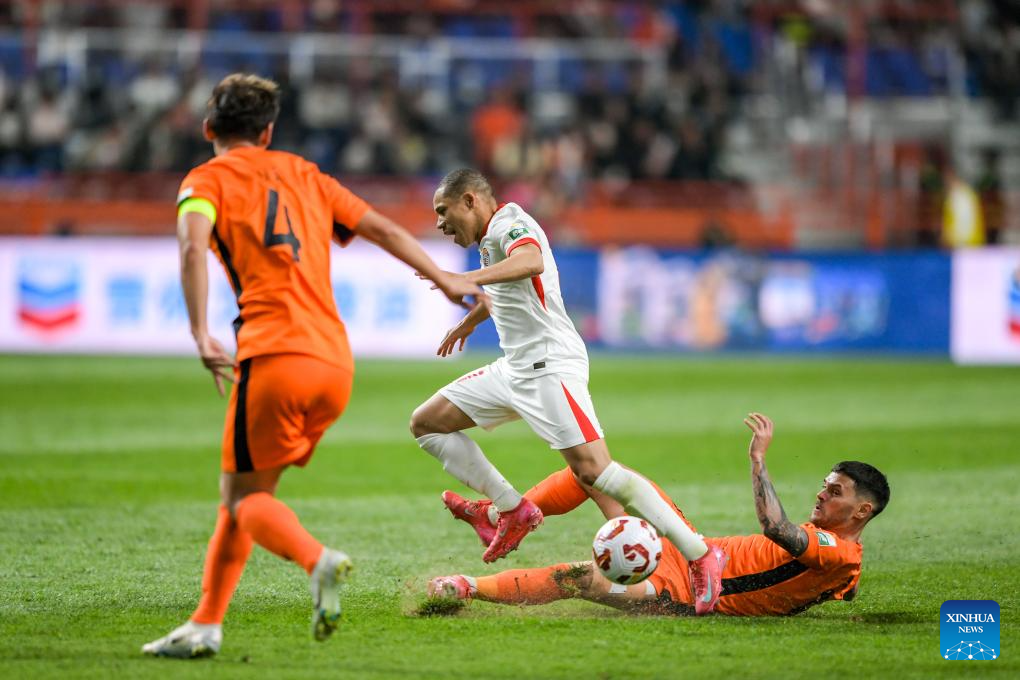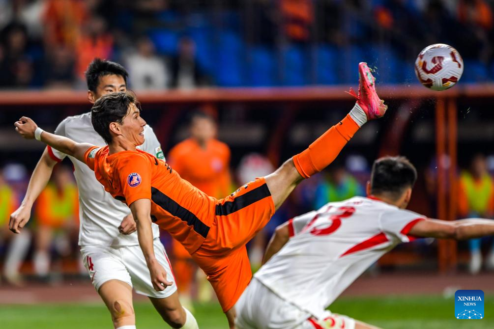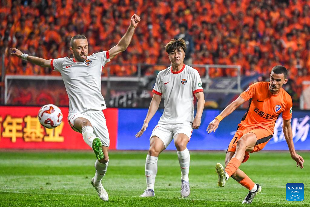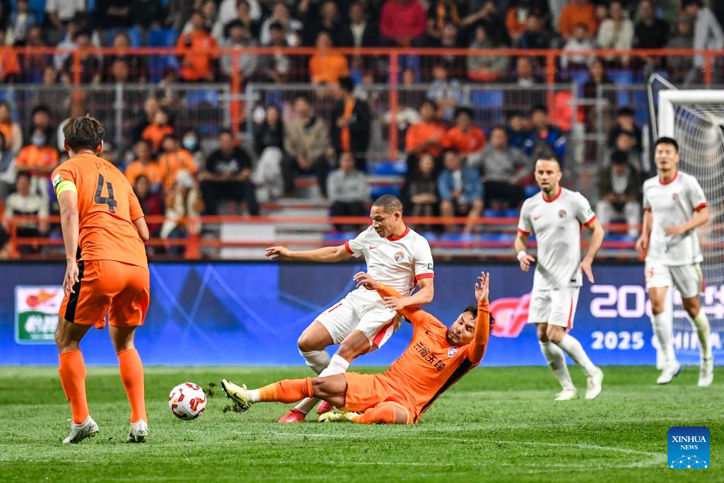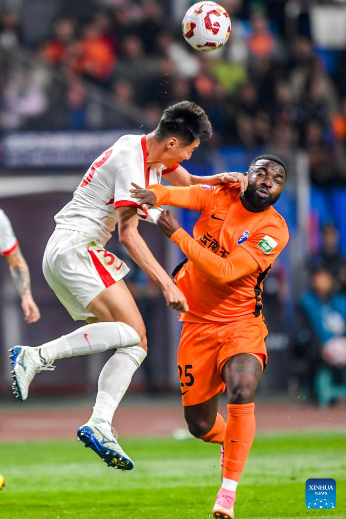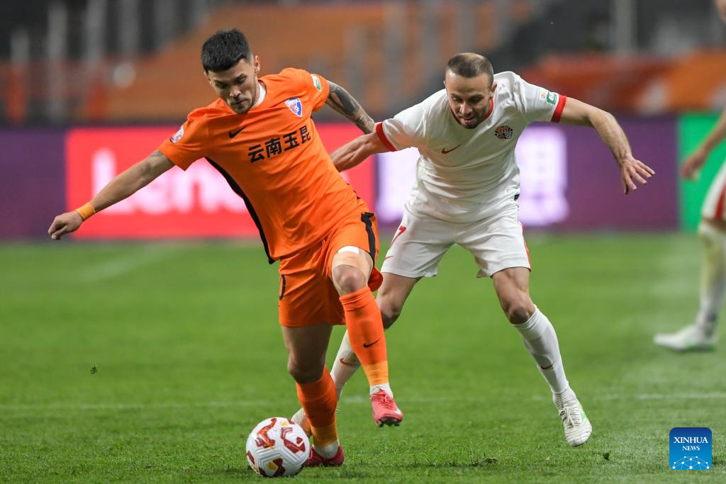 Nene (up) of Yunnan Yukun competes during the 5th round match between Yunnan Yukun and Qingdao Hainiu at the 2025 Chinese Super League (CSL) in Yuxi, southwest China's Yunnan Province, April 6, 2025. (Xinhua/Chen Xinbo)