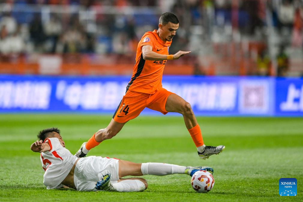Alexandru Ionita (L) of Yunnan Yukun vies with Elvis Saric of Qingdao Hainiu during the 5th round match between Yunnan Yukun and Qingdao Hainiu at the 2025 Chinese Super League (CSL) in Yuxi, southwest China's Yunnan Province, April 6, 2025. (Xinhua/Chen Xinbo)