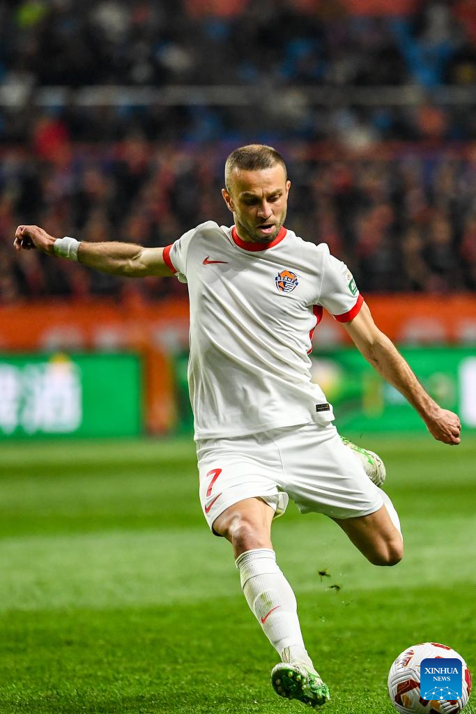 Elvis Saric of Qingdao Hainiu shoots during the 5th round match between Yunnan Yukun and Qingdao Hainiu at the 2025 Chinese Super League (CSL) in Yuxi, southwest China's Yunnan Province, April 6, 2025. (Photo by Peng Yikai/Xinhua)