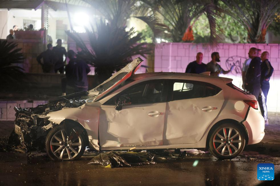 A car damaged by a rocket attack fired from the Gaza Strip is seen in Ashkelon, Israel on April 6, 2025. (Ilan Assayag/JINI via Xinhua)