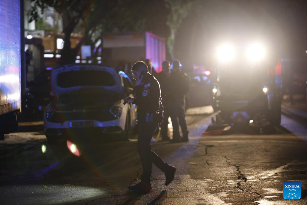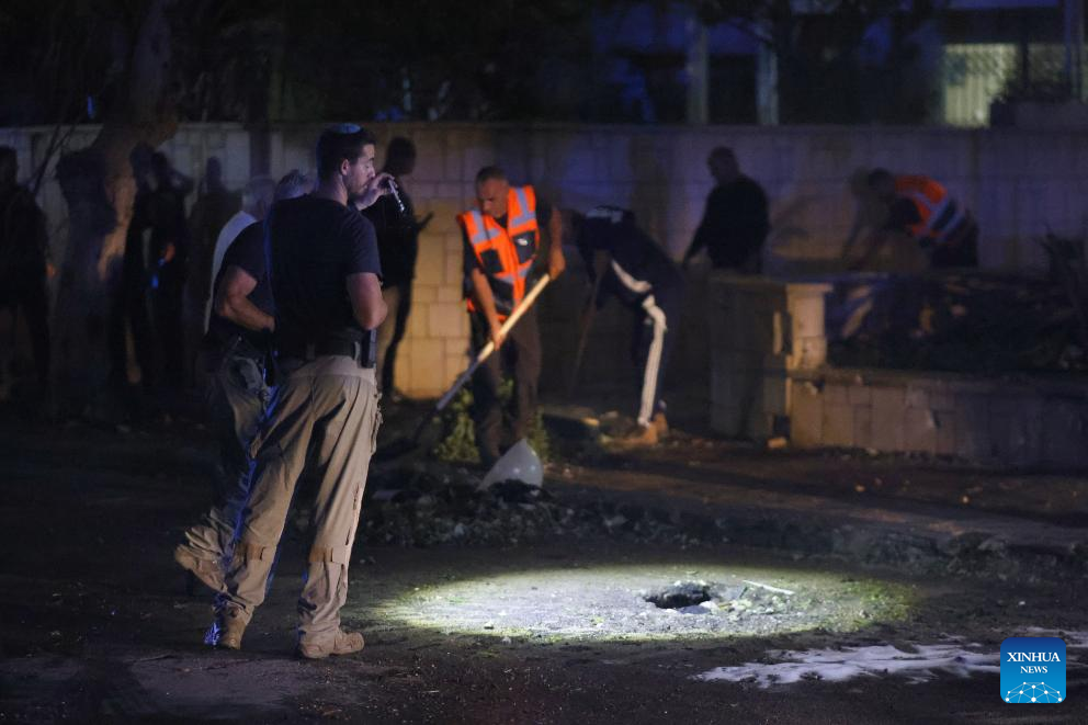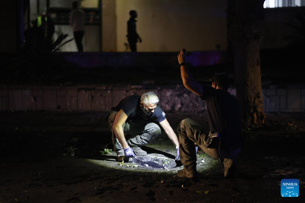 Security personnel work at a site of a rocket attack fired from the Gaza Strip, in Ashkelon, Israel on April 6, 2025. (Ilan Assayag/JINI via Xinhua)