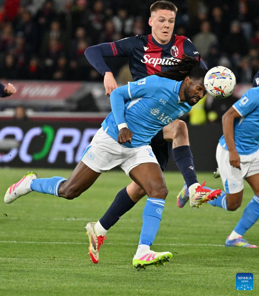 Bologna's Emil Holm (L) vies with Napoli's Frank Anguissa during a Serie A football match between Bologna and Napoli in Bologna, Italy, April 7, 2025. (Photo by Alberto Lingria/Xinhua)