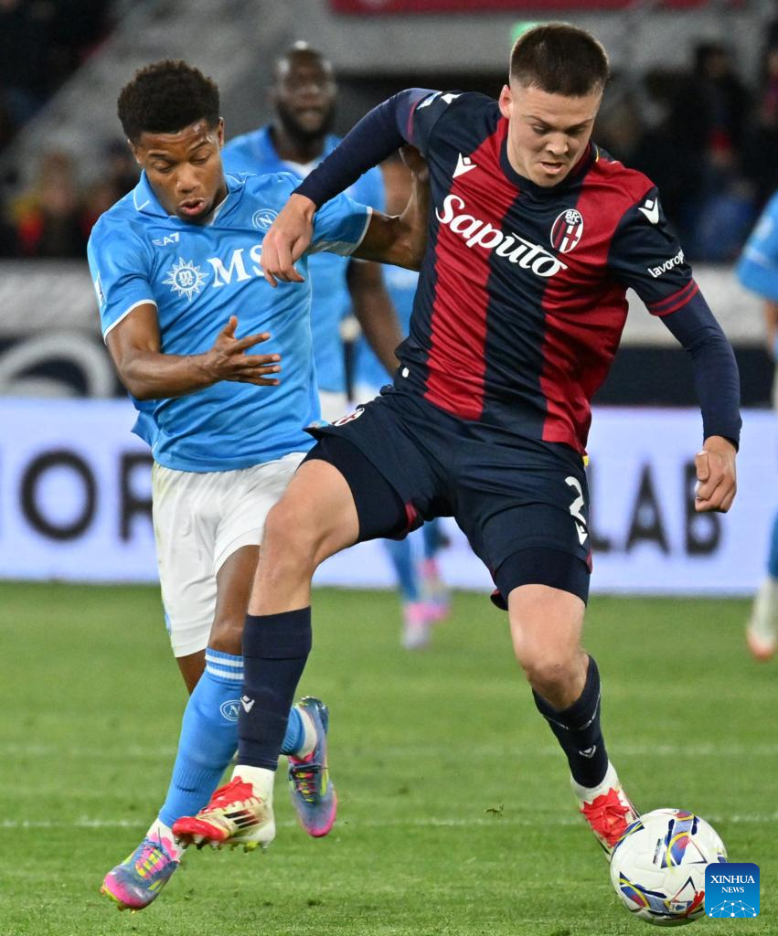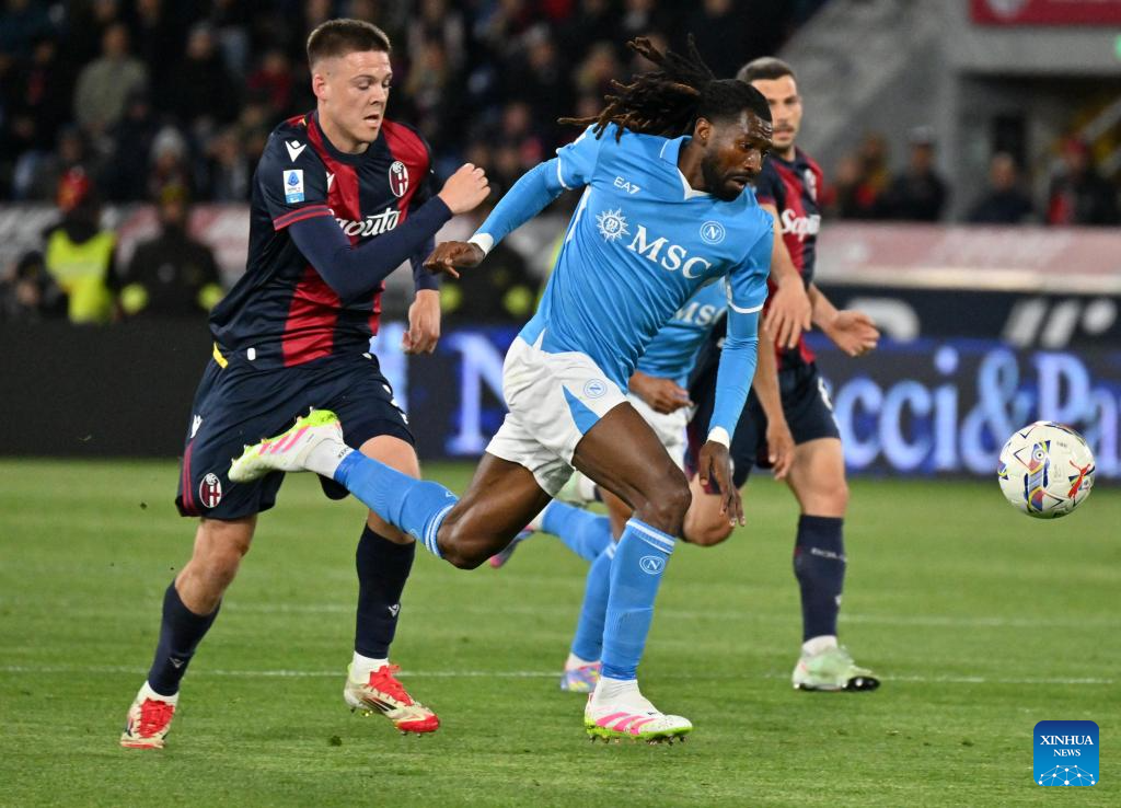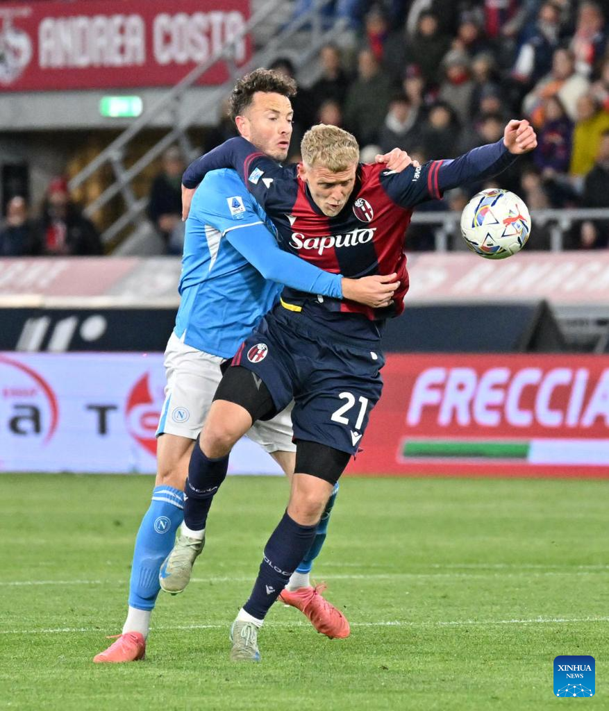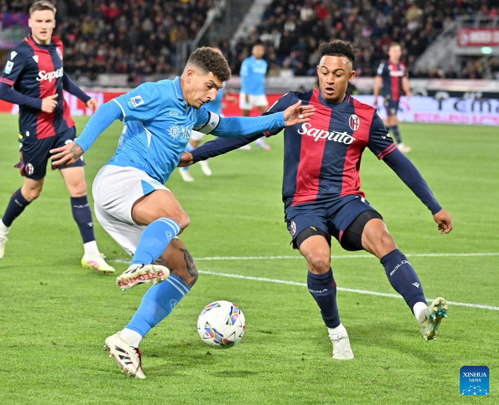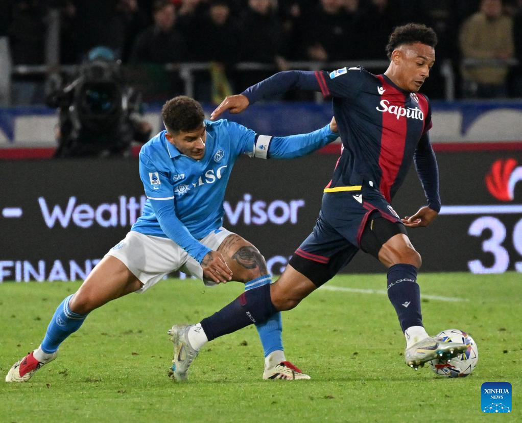 Bologna's Dan Ndoye (R) vies with Napoli's Giovanni Di Lorenzo during a Serie A football match between Bologna and Napoli in Bologna, Italy, April 7, 2025. (Photo by Alberto Lingria/Xinhua)
