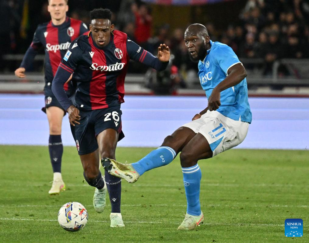 Bologna's Jhon Lucumi (front L) vies with Napoli's Romelu Lukaku during a Serie A football match between Bologna and Napoli in Bologna, Italy, April 7, 2025. (Photo by Alberto Lingria/Xinhua)