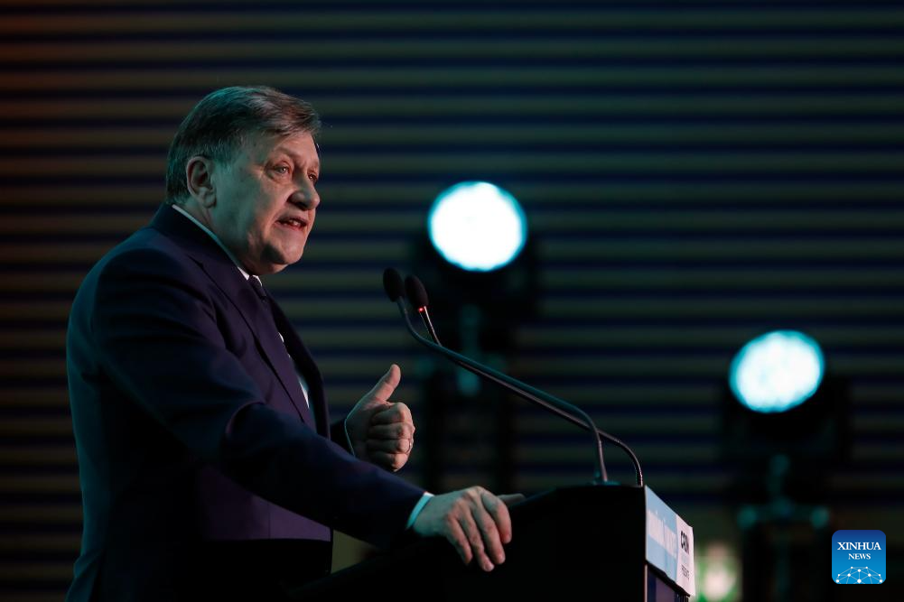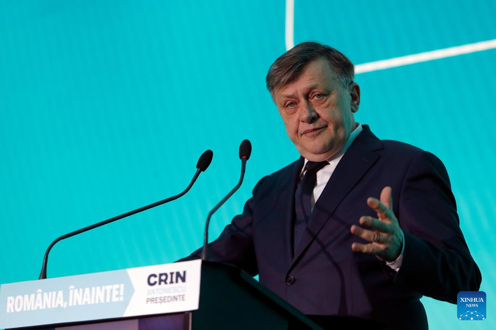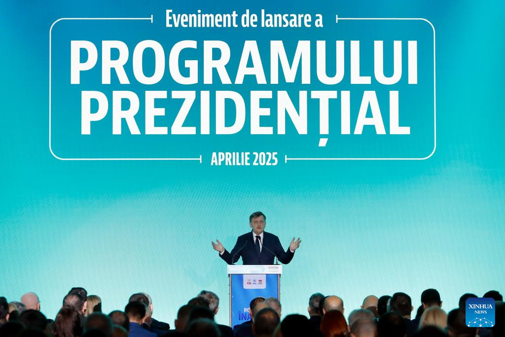 Crin Antonescu, the ruling coalition's candidate for Romania's presidency, addresses the audience during the presentation of his presidential program in Bucharest, Romania, April 9, 2025. Romania's presidential election campaign officially began on April 4, with 11 candidates competing for the country's top office. The campaign will run through May 3, ahead of the first round of voting scheduled for May 4. (Photo by Cristian Cristel/Xinhua)