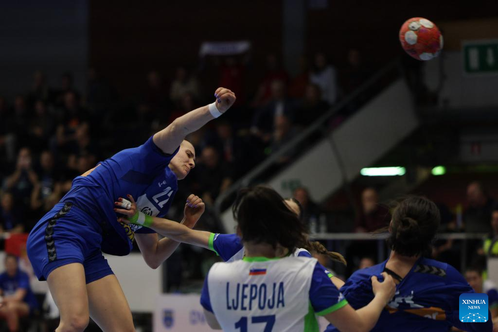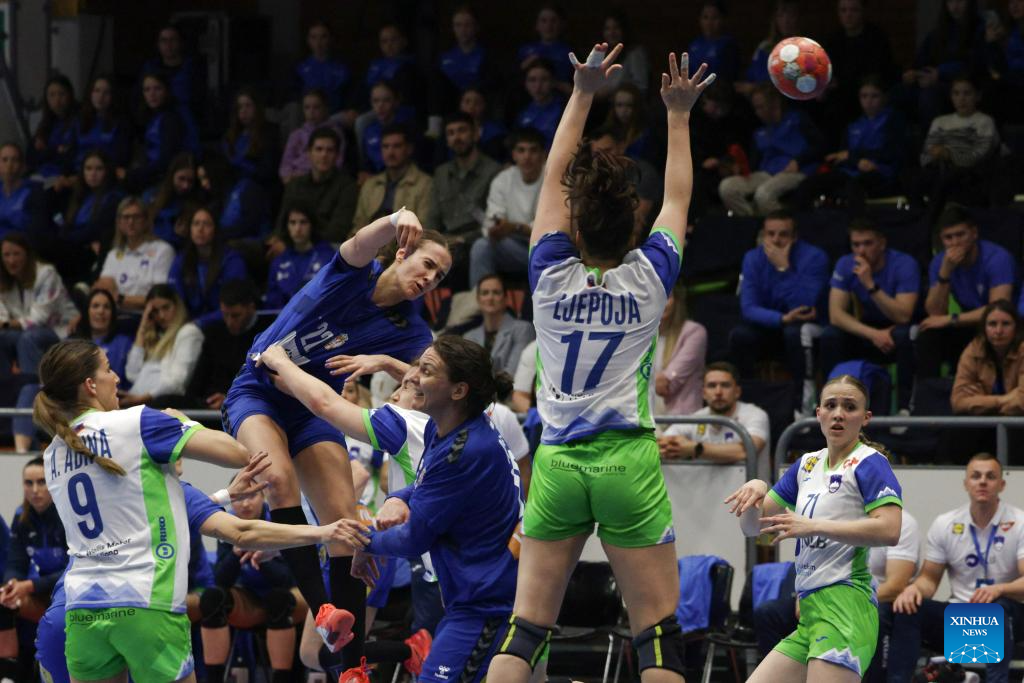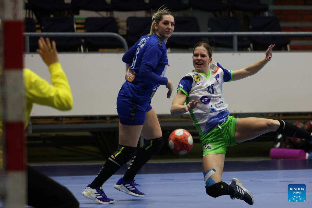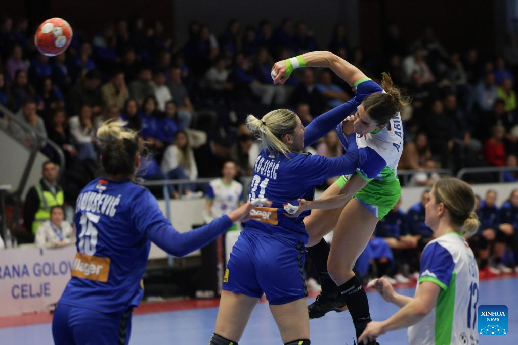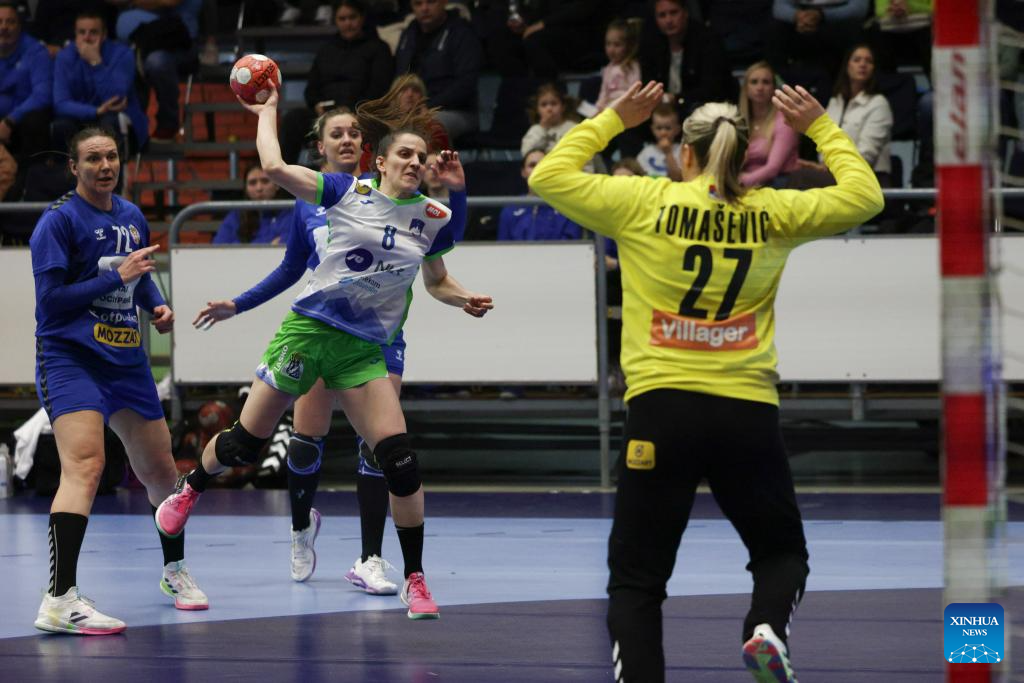 Ema Abina (2nd R) of Slovenia shoots at the goal during during the EHF Champions League Women 2025 qualification phase 2 match between Slovenia and Serbia in Celje, Slovenia, April 9, 2025. (Photo by Zeljko Stevanic/Xinhua)