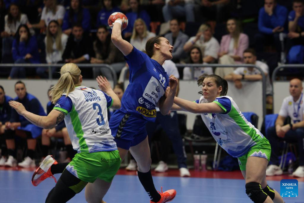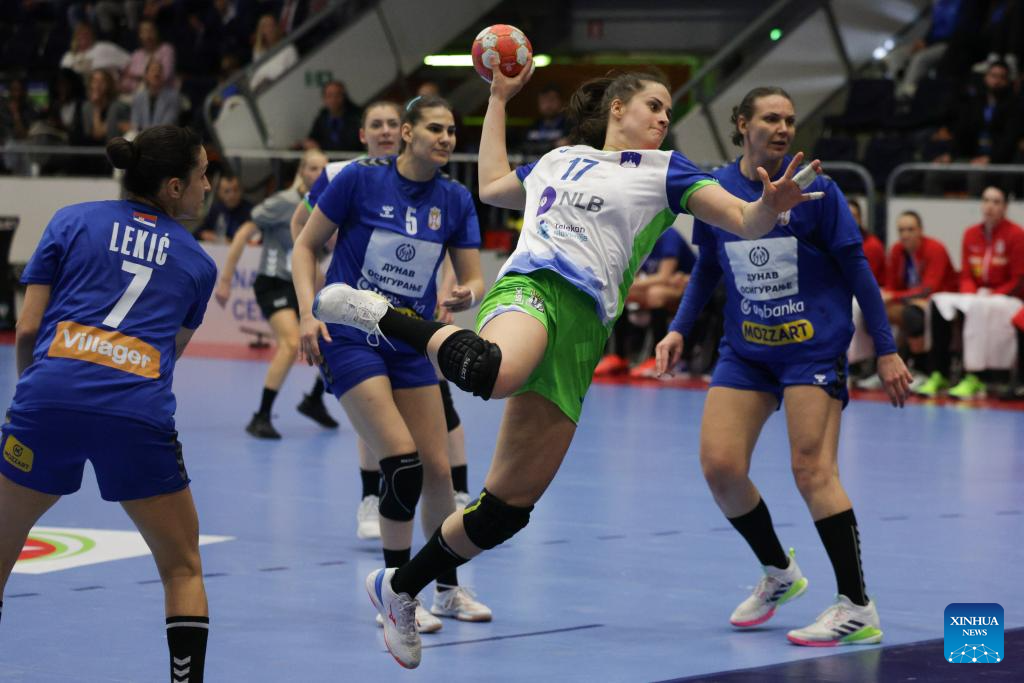 Natasa Ljepoja (2nd R) of Slovenia shoots at the goal during the EHF Champions League Women 2025 qualification phase 2 match between Slovenia and Serbia in Celje, Slovenia, April 9, 2025. (Photo by Zeljko Stevanic/Xinhua)