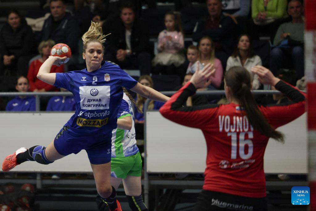 Sanja Radosavljevic (L) of Serbia shoots at the goal during the EHF Champions League Women 2025 qualification phase 2 match between Slovenia and Serbia in Celje, Slovenia, April 9, 2025. (Photo by Zeljko Stevanic/Xinhua)
