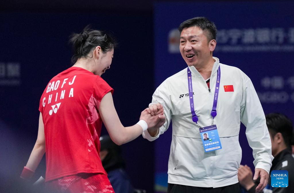 Gao Fangjie (L) of China celebrates with coach Luo Yigang after winning the women's singles round of 16 match against Miyazaki Tomoka of Japan at Badminton Asia Championships 2025 in Ningbo, east China's Zhejiang Province, April 10, 2025. (Xinhua/Sun Fei)