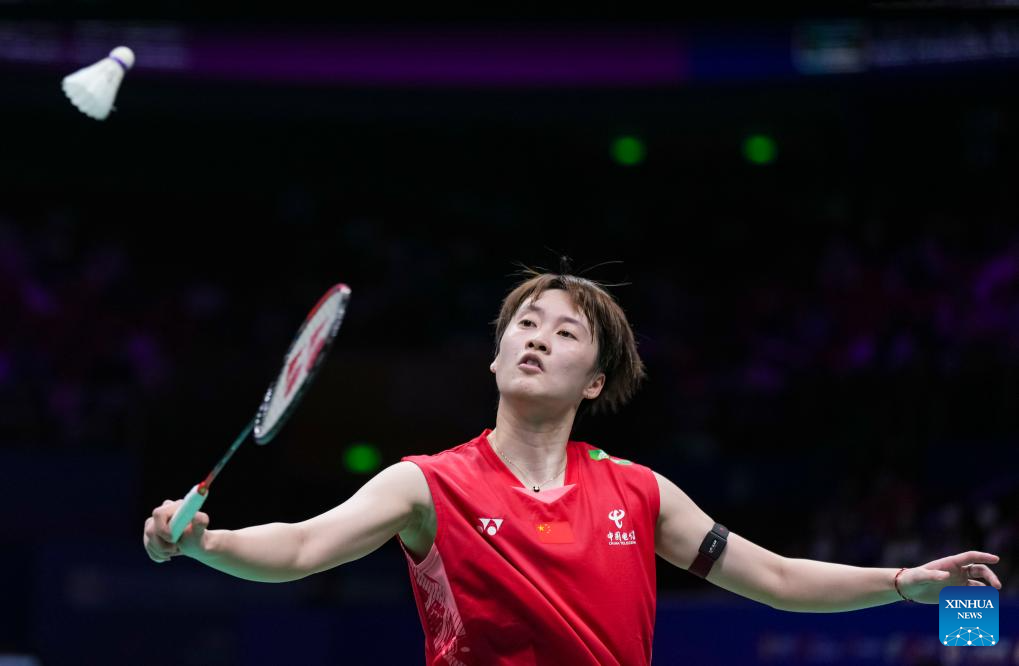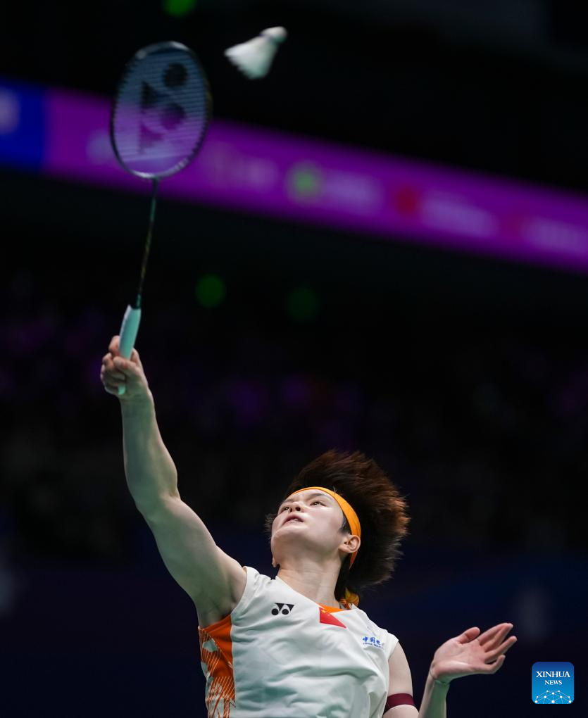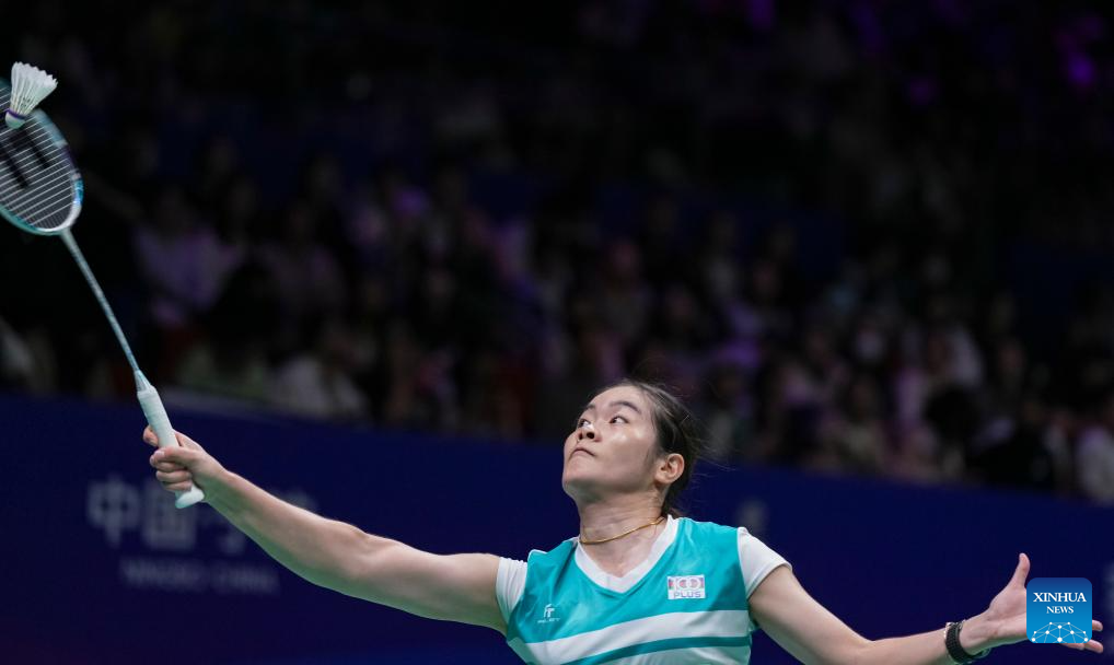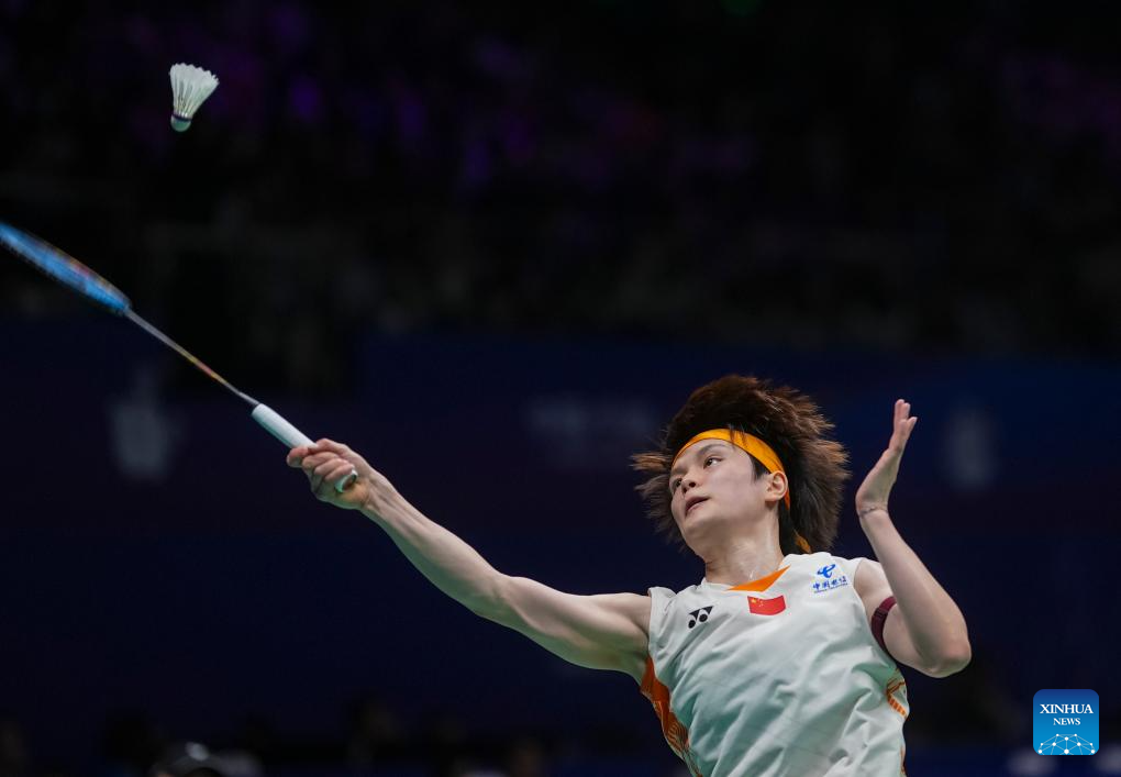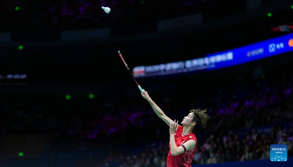 Chen Yufei of China hits a return during the women's singles round of 16 match against Busanan Ongbamrungphan of Thailand at Asia Championships 2025 badminton tournament in Ningbo, east China's Zhejiang Province, April 10, 2025. (Xinhua/Sun Fei)