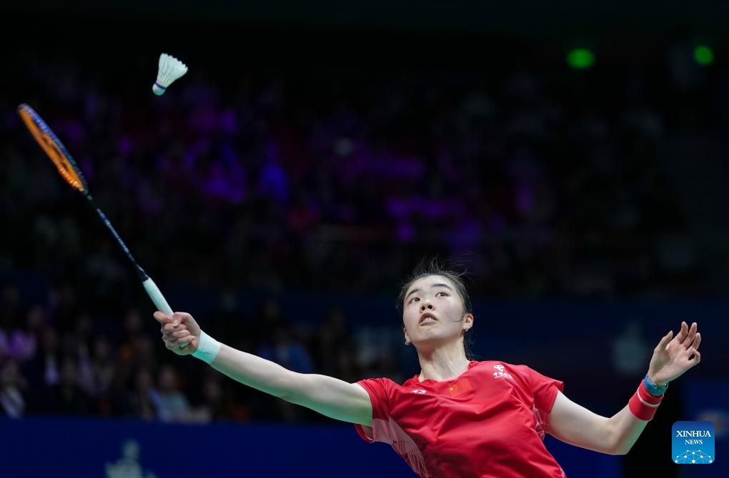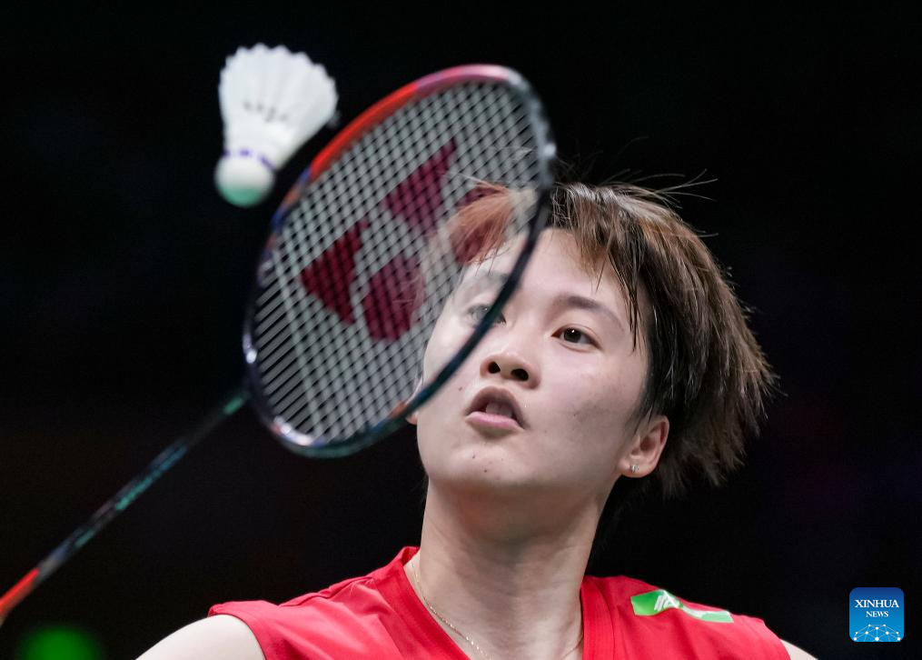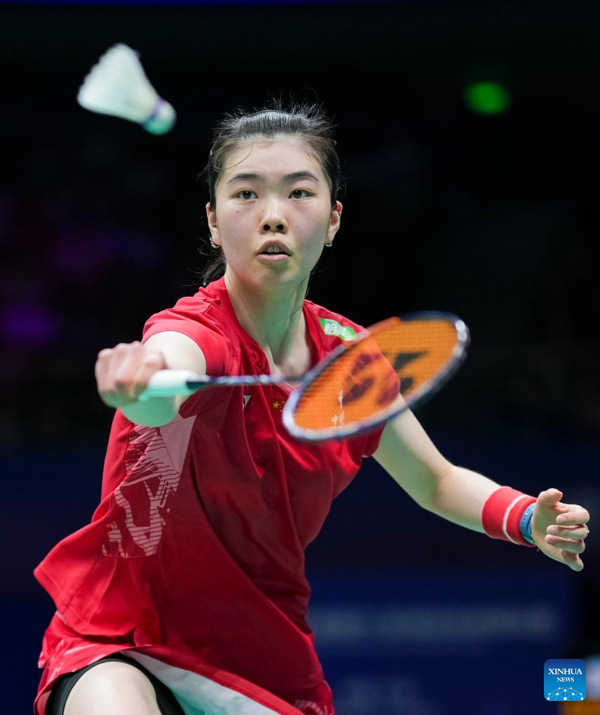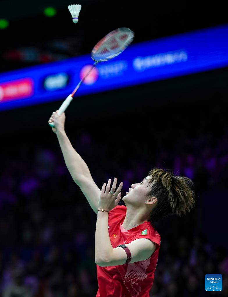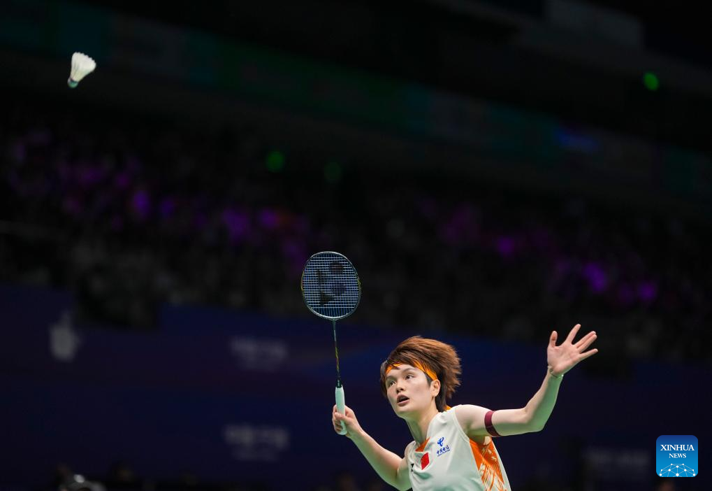 Chen Yufei of China hits a return during the women's singles round of 16 match against Busanan Ongbamrungphan of Thailand at Asia Championships 2025 badminton tournament in Ningbo, east China's Zhejiang Province, April 10, 2025. (Xinhua/Sun Fei)