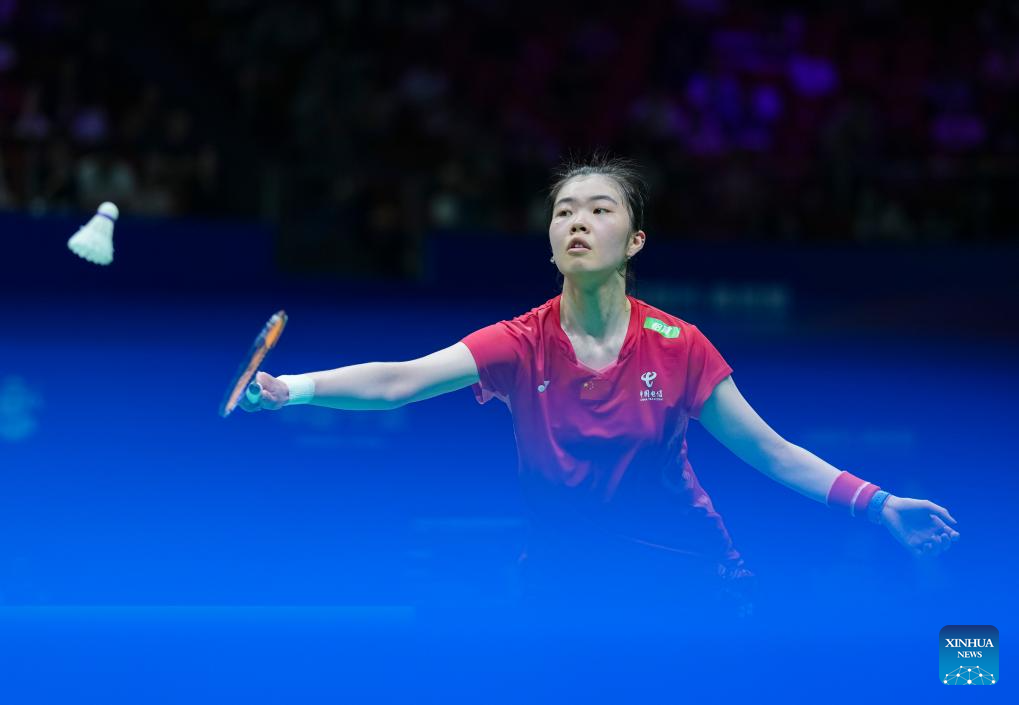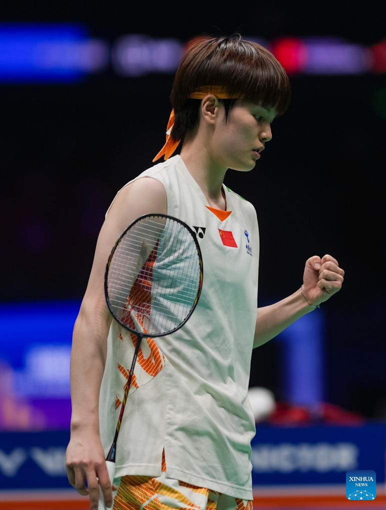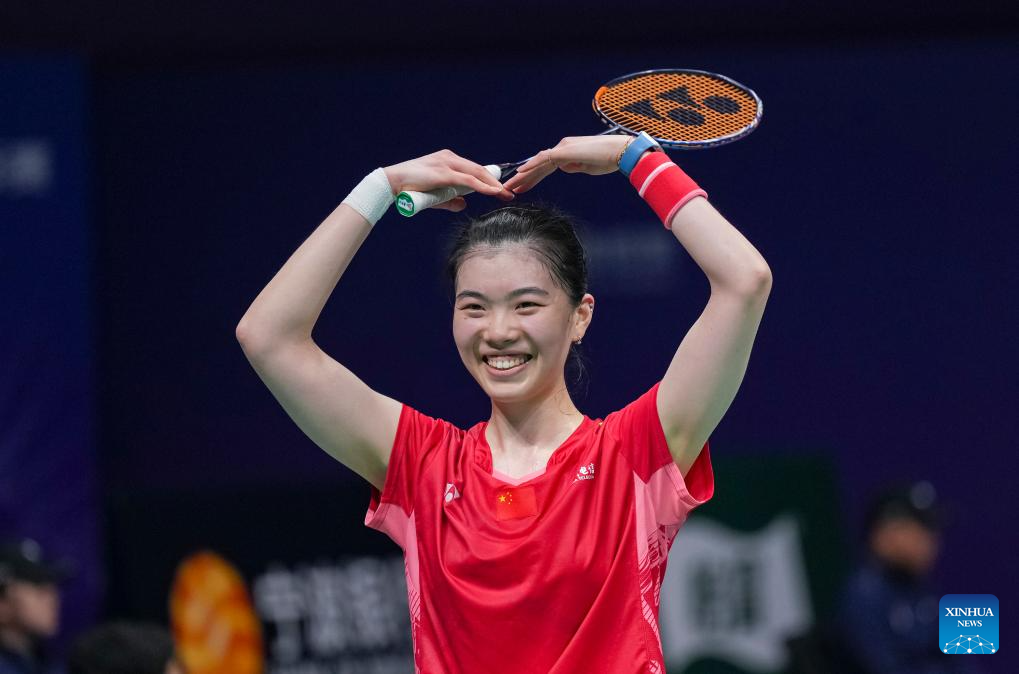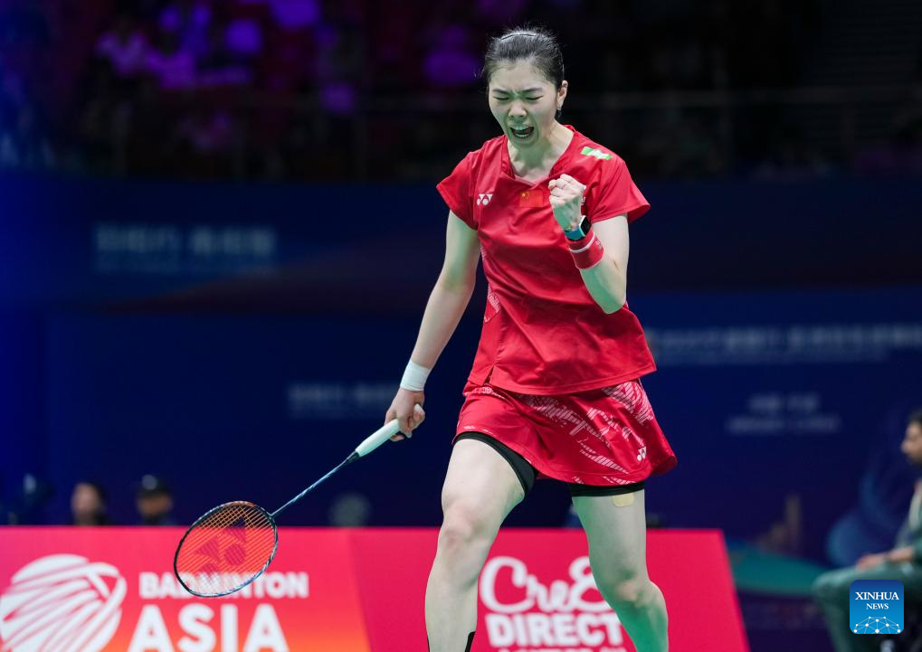 Wang Zhiyi of China celebrates a point during the women's singles round of 16 match against Sim Yu Jin of South Korea at Badminton Asia Championships 2025 in Ningbo, east China's Zhejiang Province, April 10, 2025. (Xinhua/Sun Fei)
