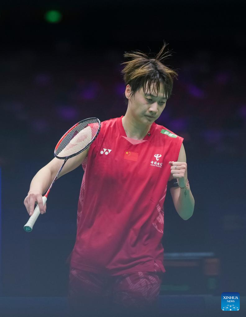 Chen Yufei of China celebrates a score during the women's singles round of 16 match against Busanan Ongbamrungphan of Thailand at Asia Championships 2025 badminton tournament in Ningbo, east China's Zhejiang Province, April 10, 2025. (Xinhua/Sun Fei)