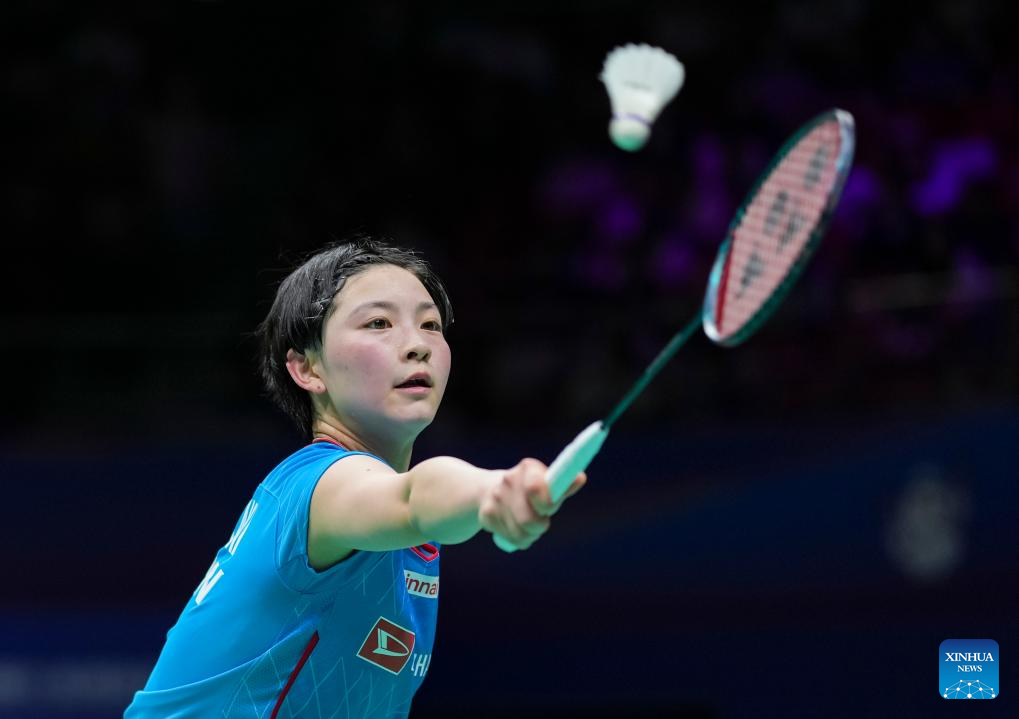 Miyazaki Tomoka of Japan hits a return during the women's singles round of 16 match against Gao Fangjie of China at Badminton Asia Championships 2025 in Ningbo, east China's Zhejiang Province, April 10, 2025. (Xinhua/Sun Fei)