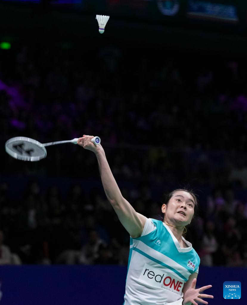 Busanan Ongbamrungphan of Thailand hits a return during the women's singles round of 16 match against Chen Yufei of China at Asia Championships 2025 badminton tournament in Ningbo, east China's Zhejiang Province, April 10, 2025. (Xinhua/Sun Fei)