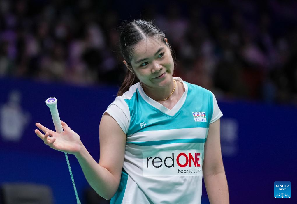 Busanan Ongbamrungphan of Thailand reacts during the women's singles round of 16 match against Chen Yufei of China at Asia Championships 2025 badminton tournament in Ningbo, east China's Zhejiang Province, April 10, 2025. (Xinhua/Sun Fei)